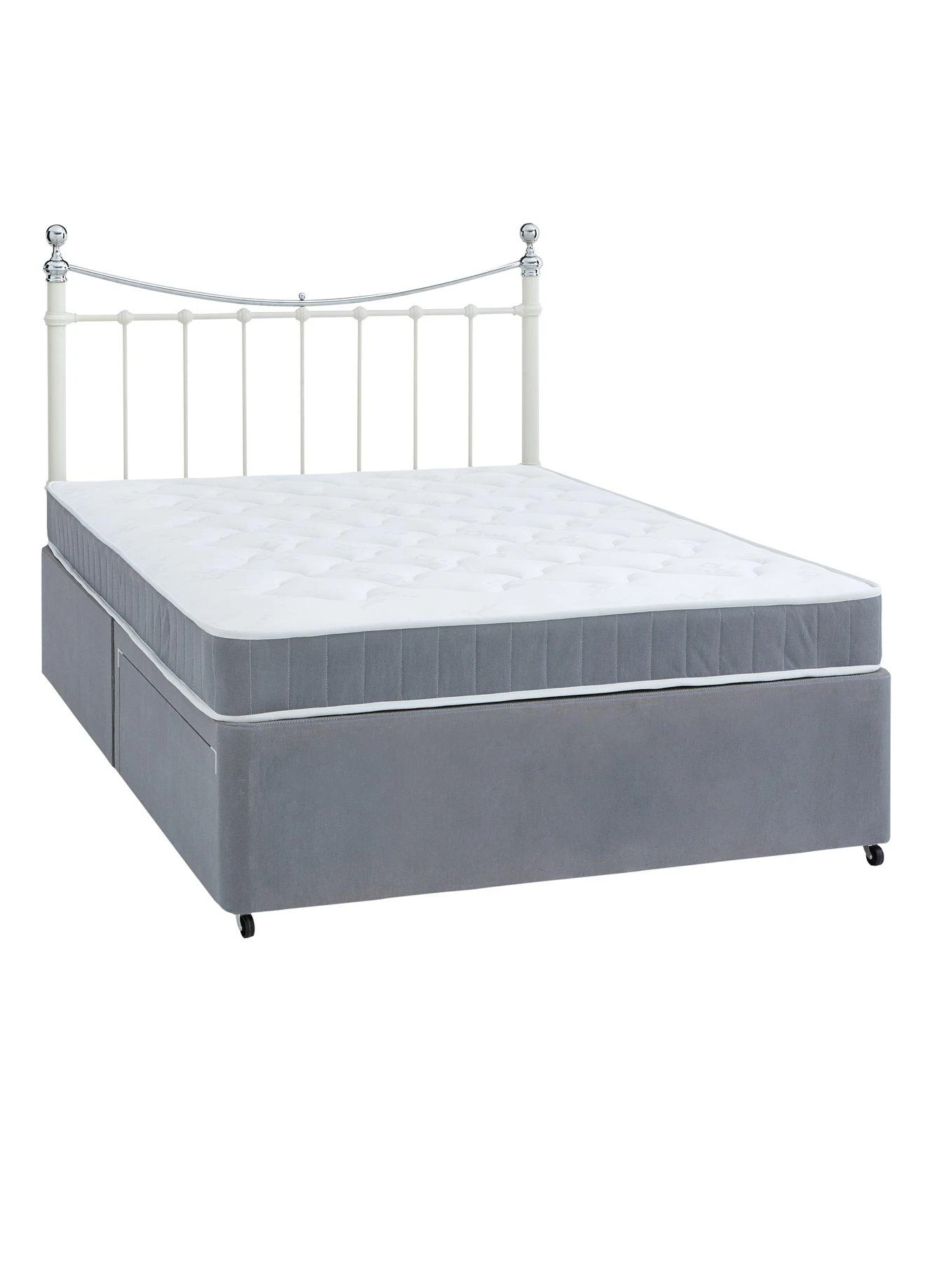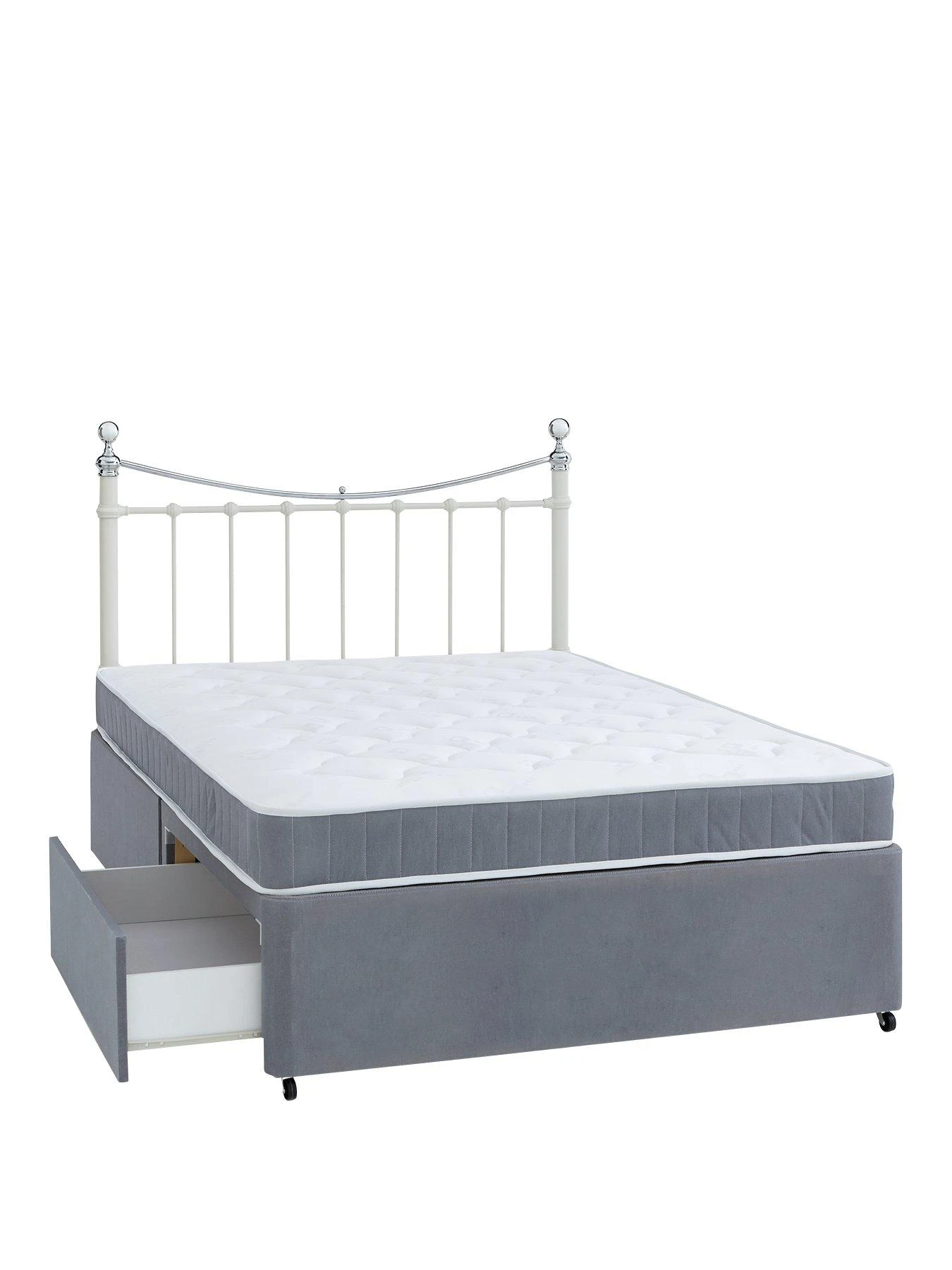 Designed with a contrasting pure white mattress sleep surface made with the finest damask fabric, it flaunts an on stylish grey border that coordinates perfectly with the sleek divan base.