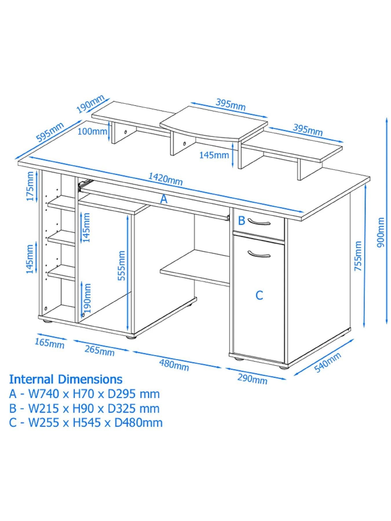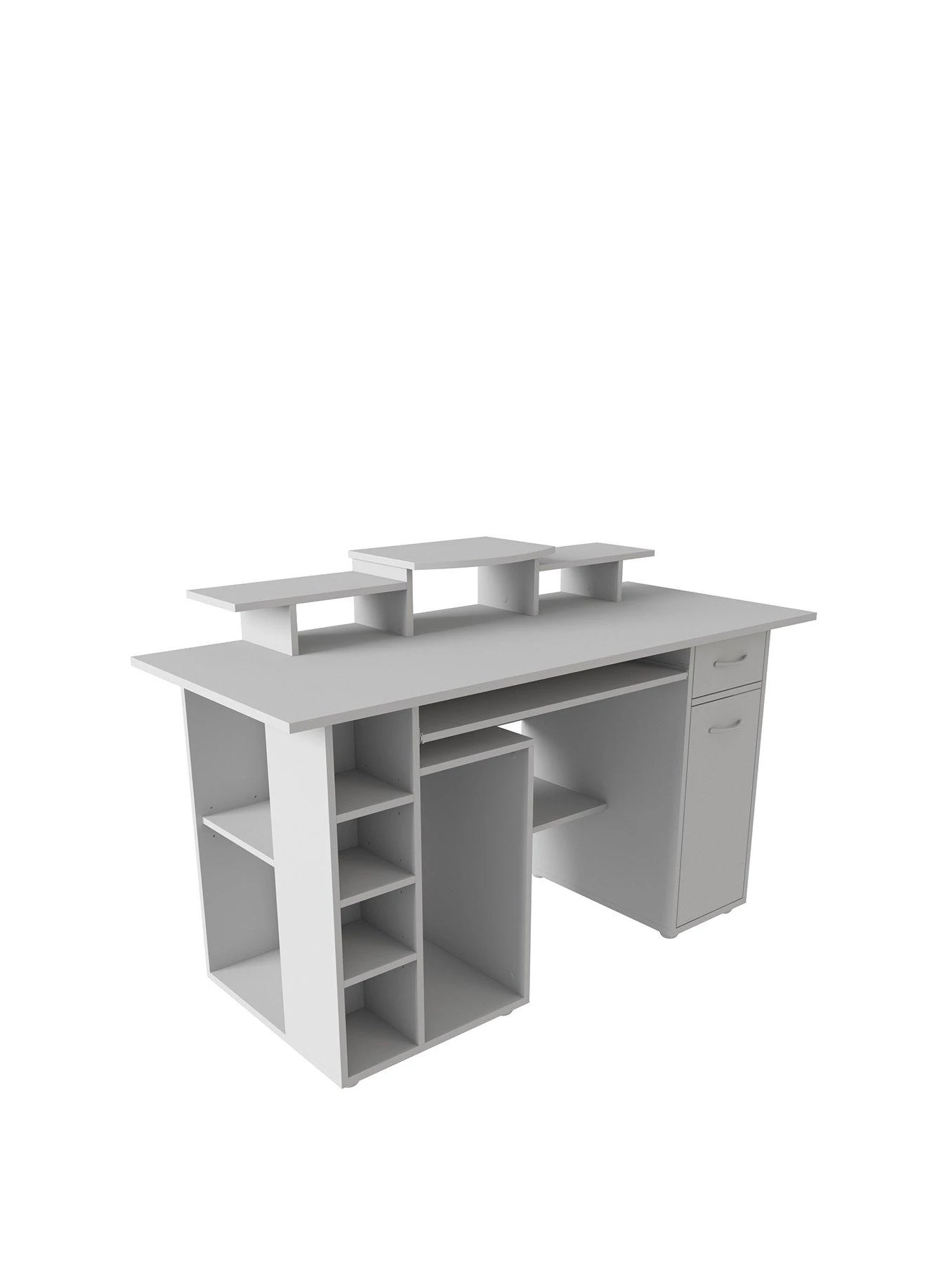 - 3 raised monitor platforms with 4 additional storage areas