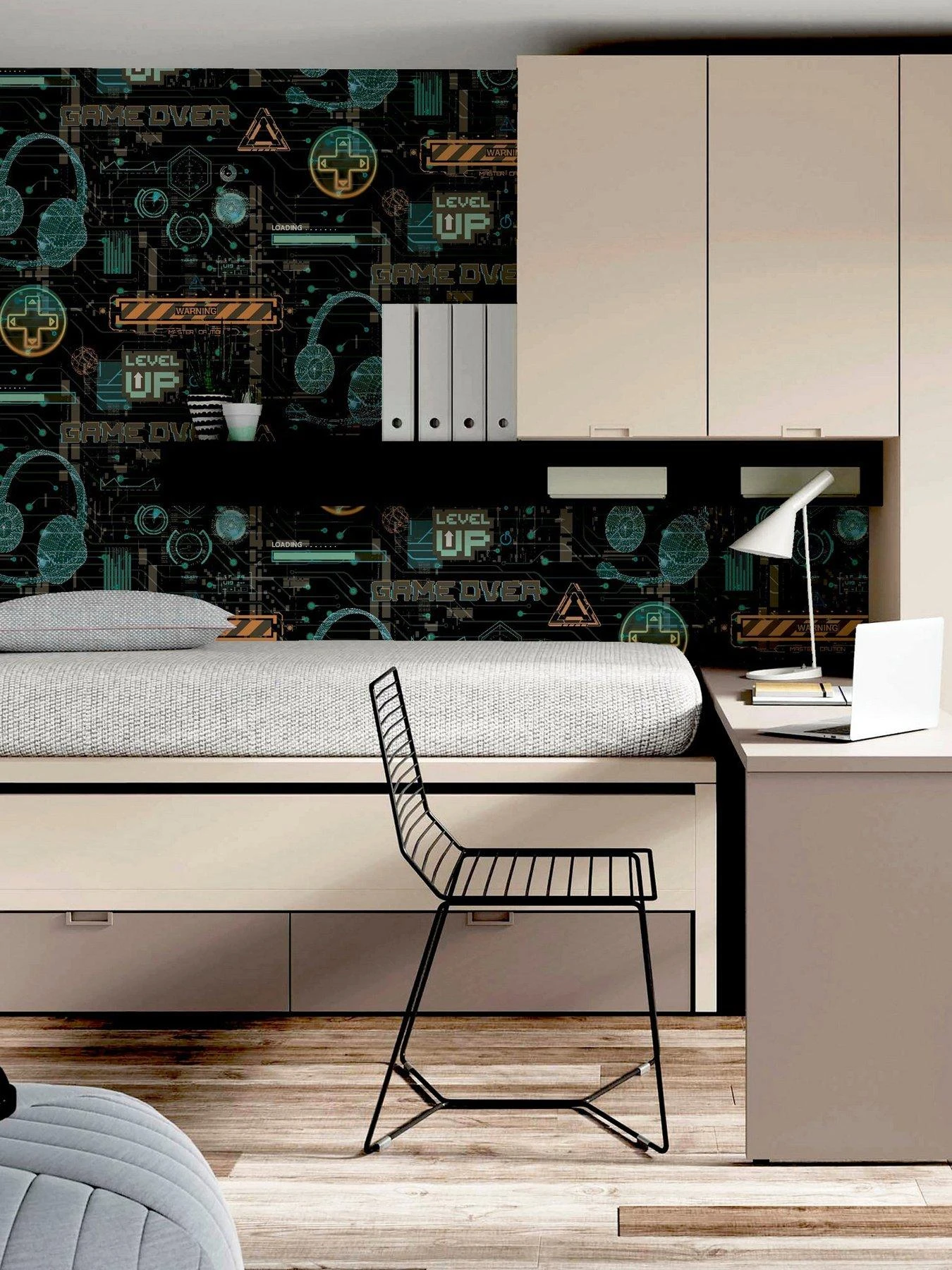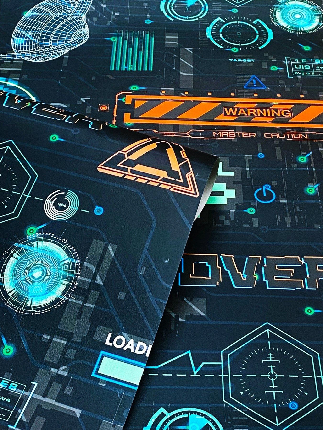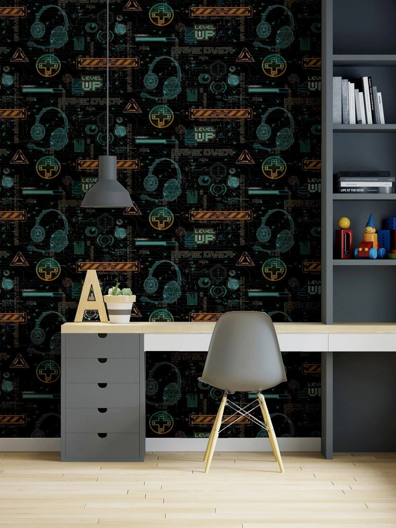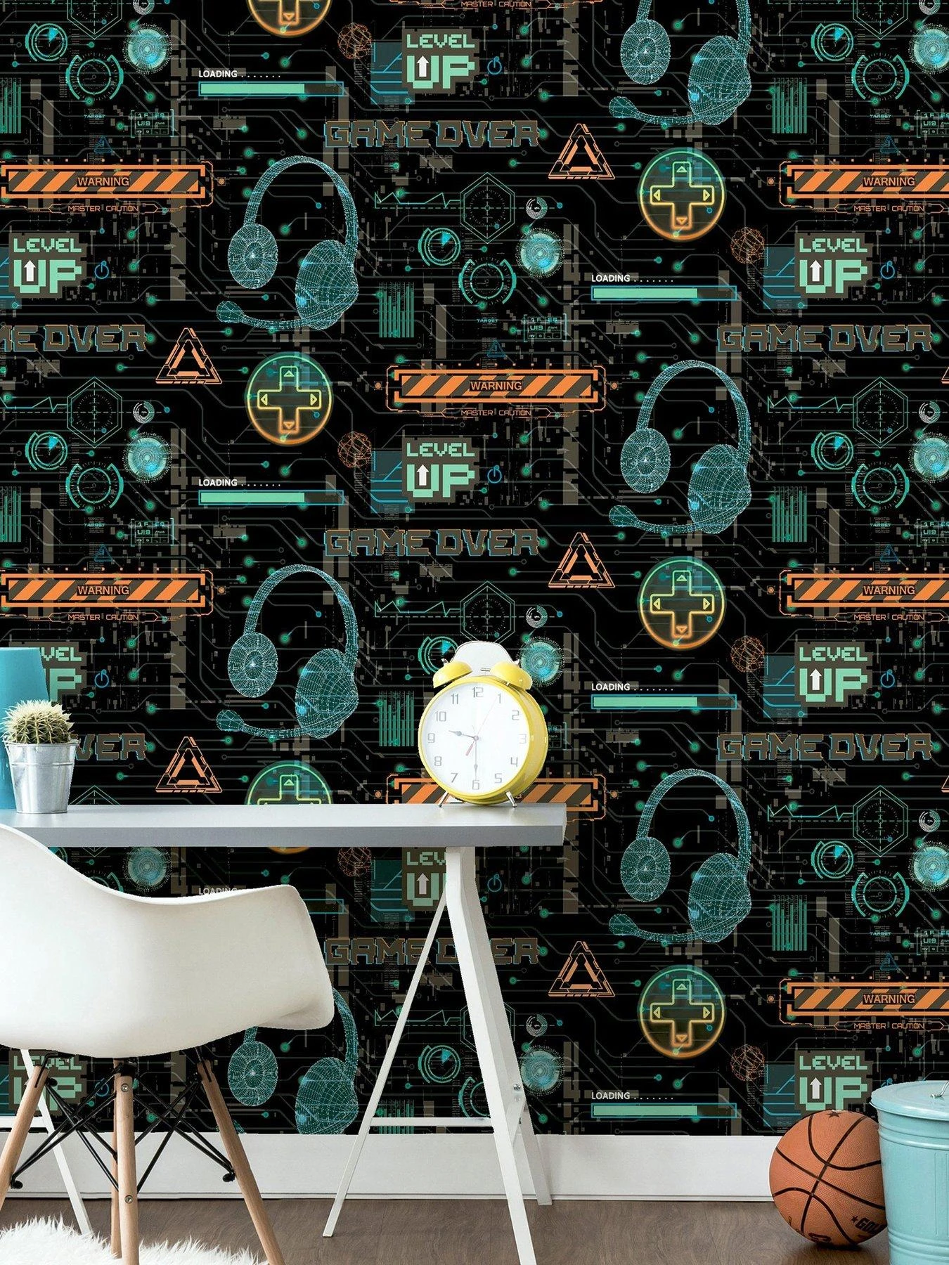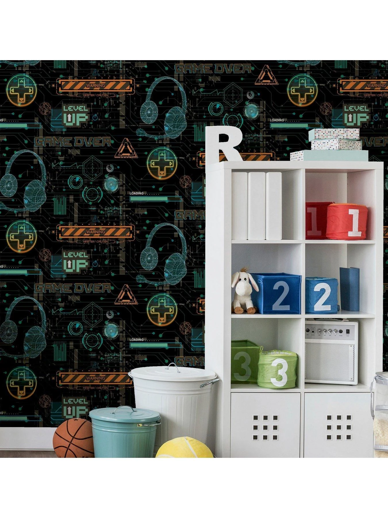 Against a black backdrop, the awesome design features neon artwork with headsets and d-pads, as well as graphical glitches and cool typography all over. The contrasting look is sure to impress your resident gamer, so it looks awesome when used as the backdrop to a dedicated gaming space.