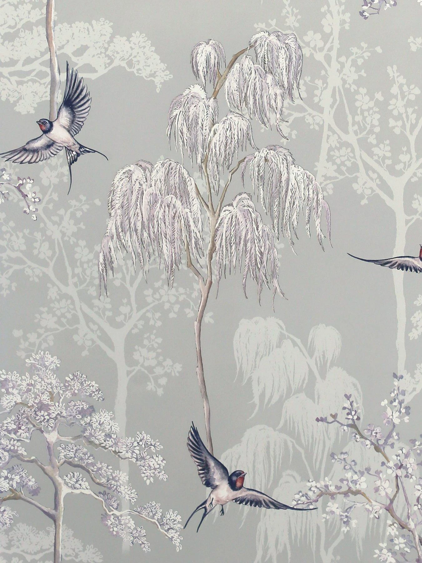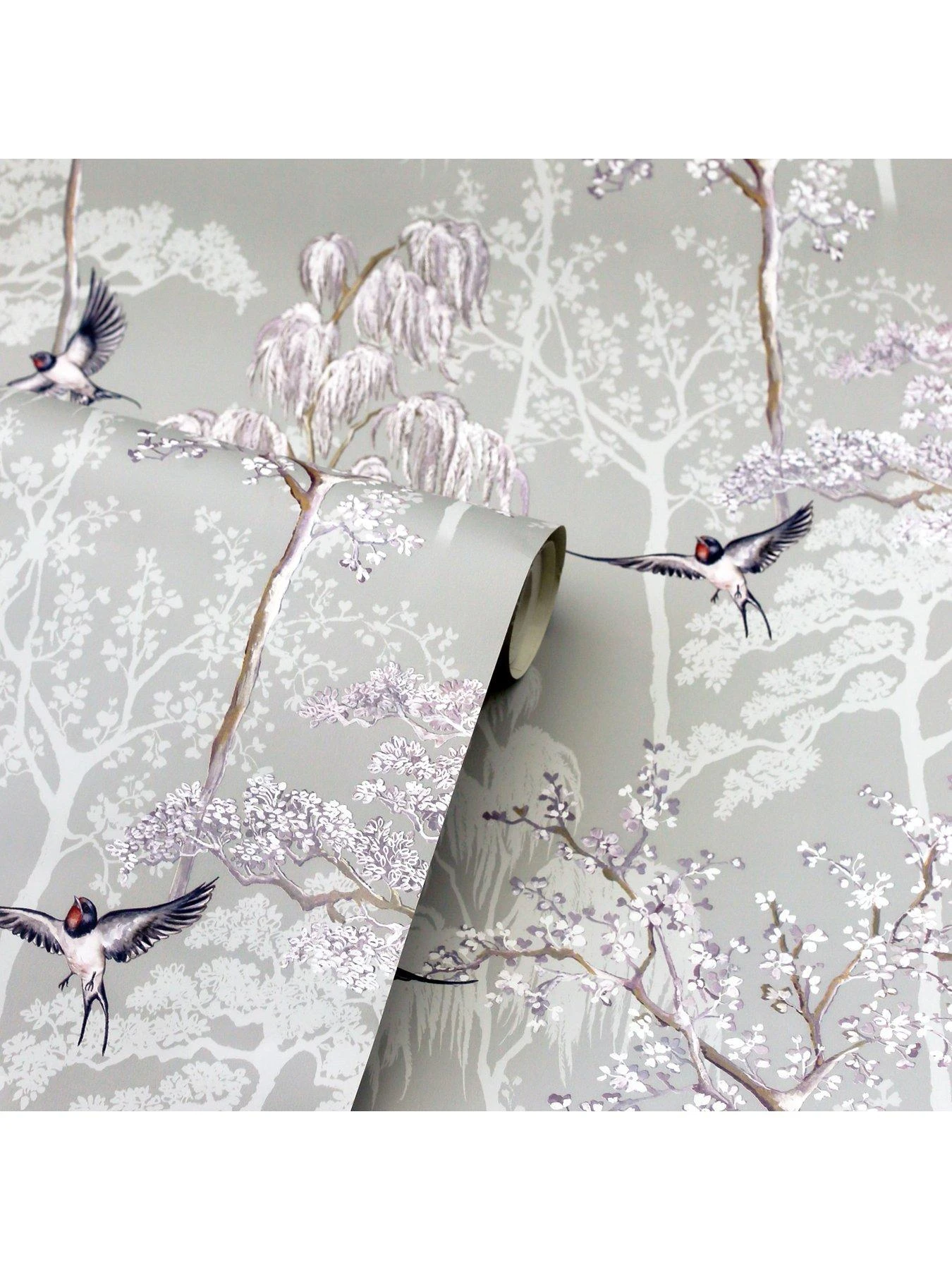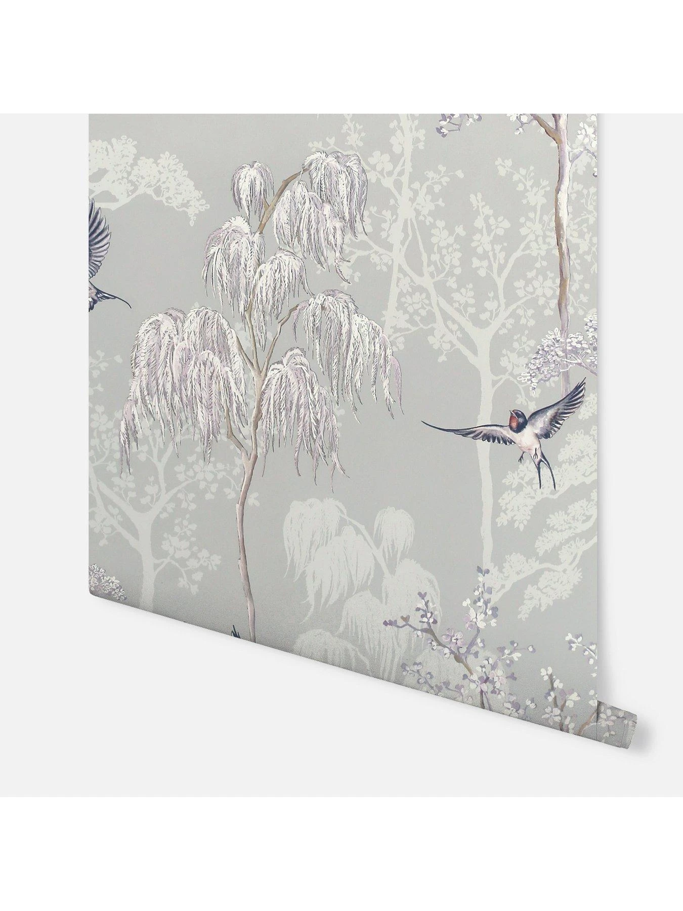 This eye-catching and stylish wallpaper design is filled with beautifully hand drawn oriental trees and birds on a soft grey coloured background. The hand drawn pattern is enhanced with pearlescent highlights that adds interest and texture to the design. This wallpaper is the perfect choice for a feature wall in a living room, a bedroom, or a hallway.