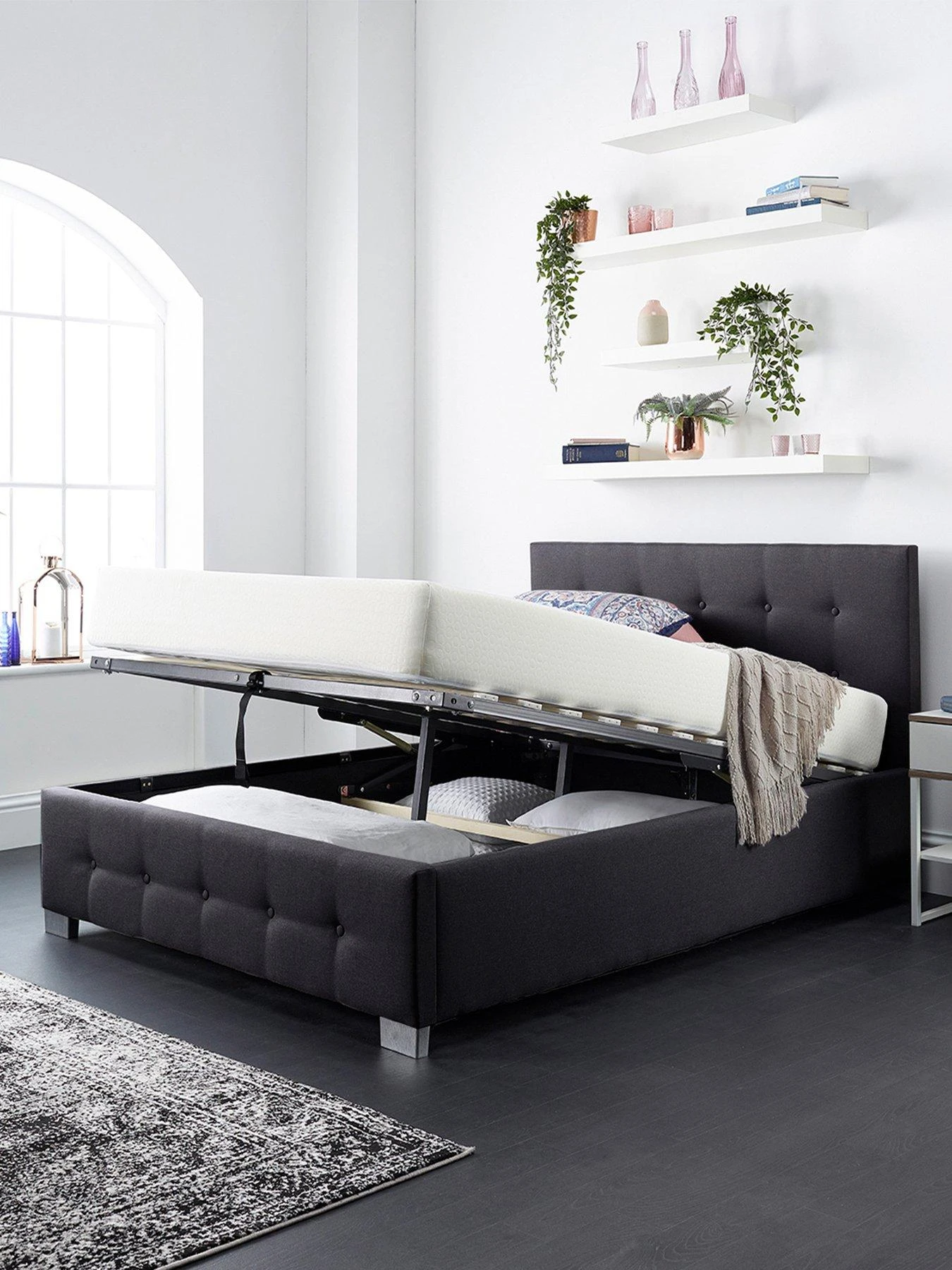 This storage ottoman bed by Aspire has a classic buttoned finish to the headboard and footboard. The padded headboard provides added comfort when sitting up in bed, and the whole thing is wrapped in a quality linen fabric.