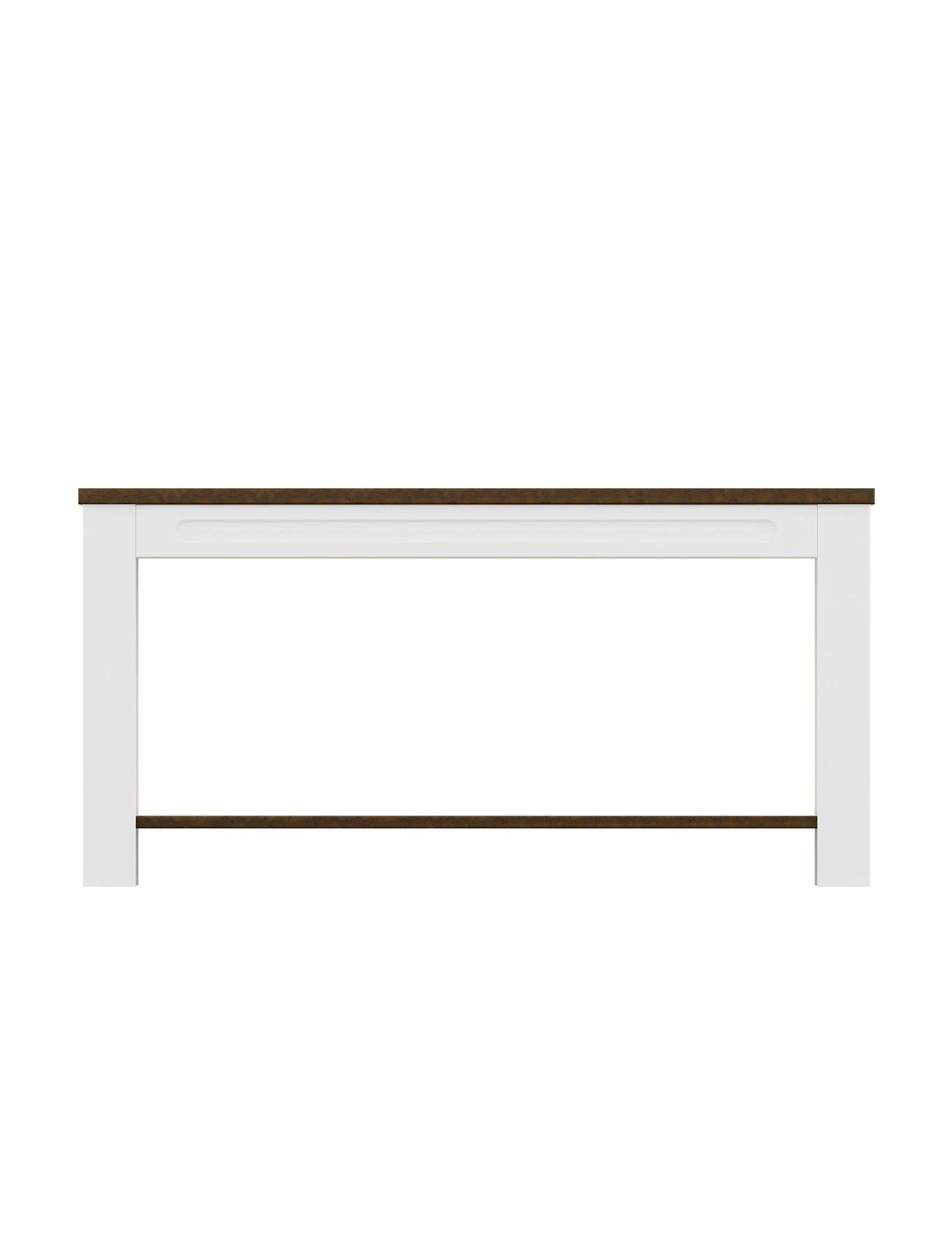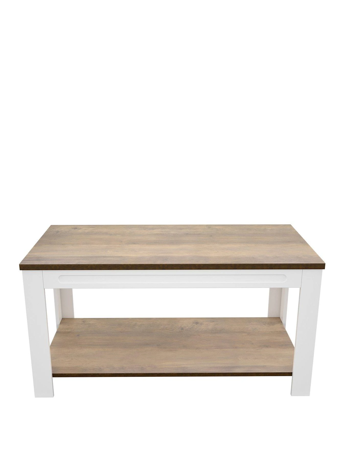 Its smart style is all down to the mix of finishes that sees a smooth satin white contrasted with a rustic wood-effect top and shelf.