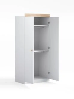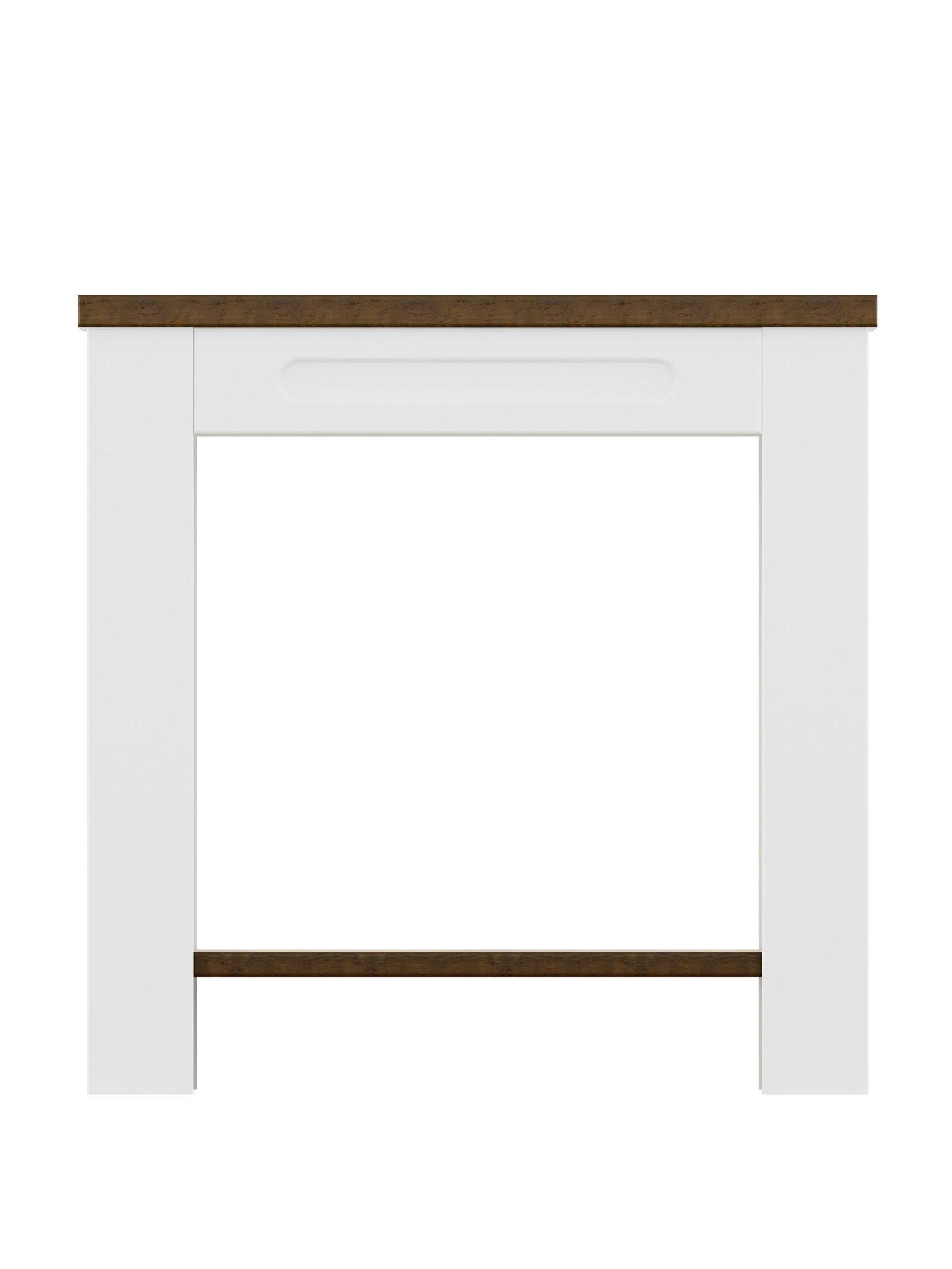 Its smart style is all down to the mix of finishes that sees a smooth satin white contrasted with a rustic wood-effect top and shelf.