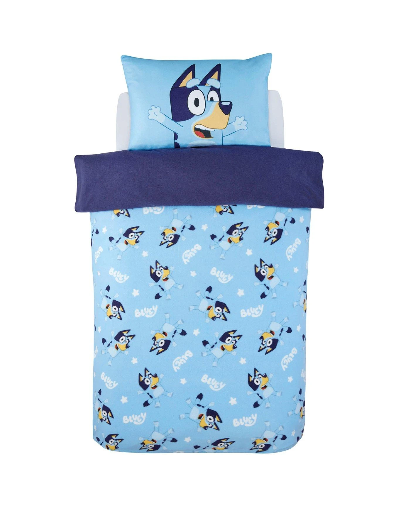 Crafted from a cosy fleece material to keep them snug and warm on chilly nights, the reversible set features a fun repeating print of Bluey to one side, with a plain blue reverse that lets them flip it over whenever they feel like a different look.