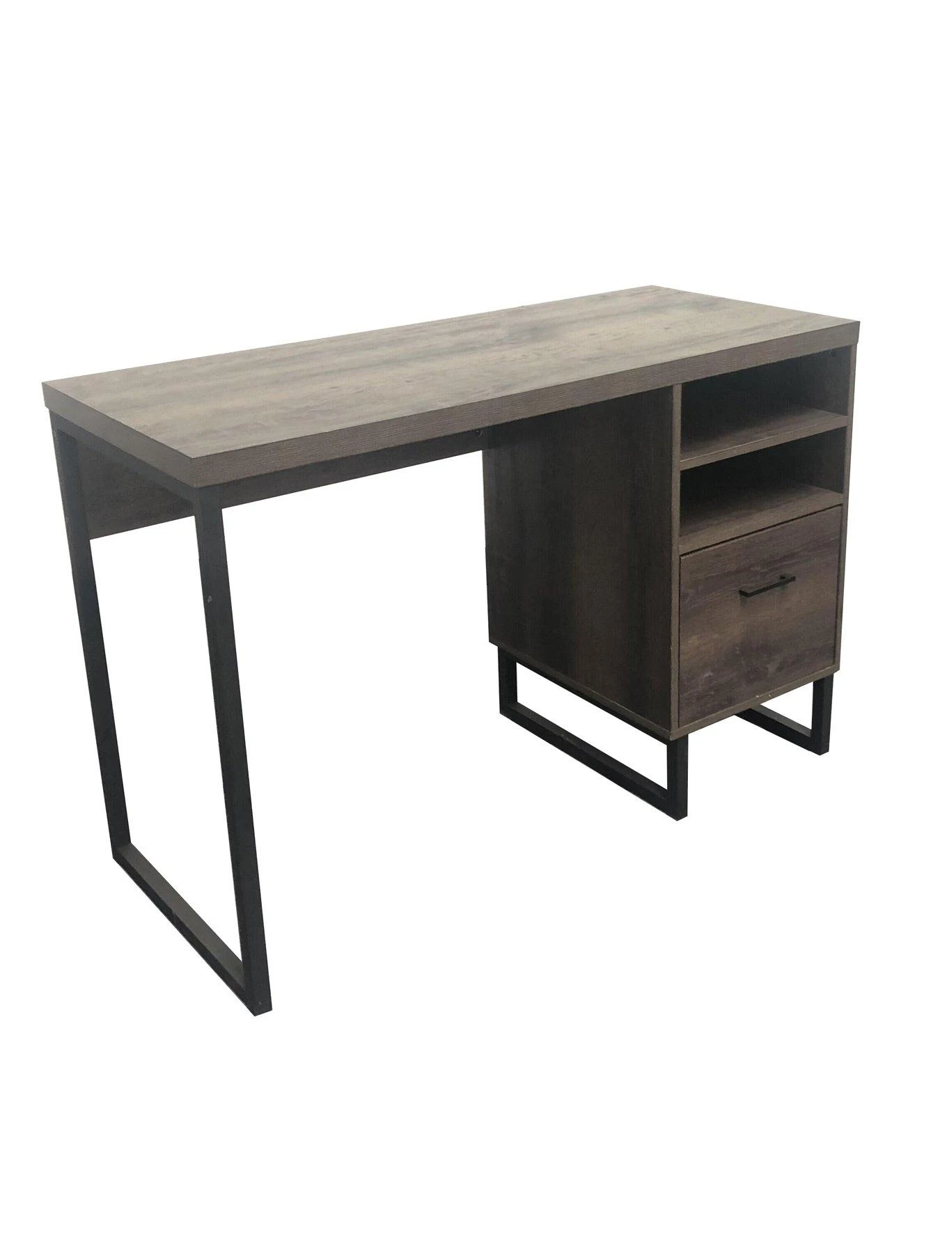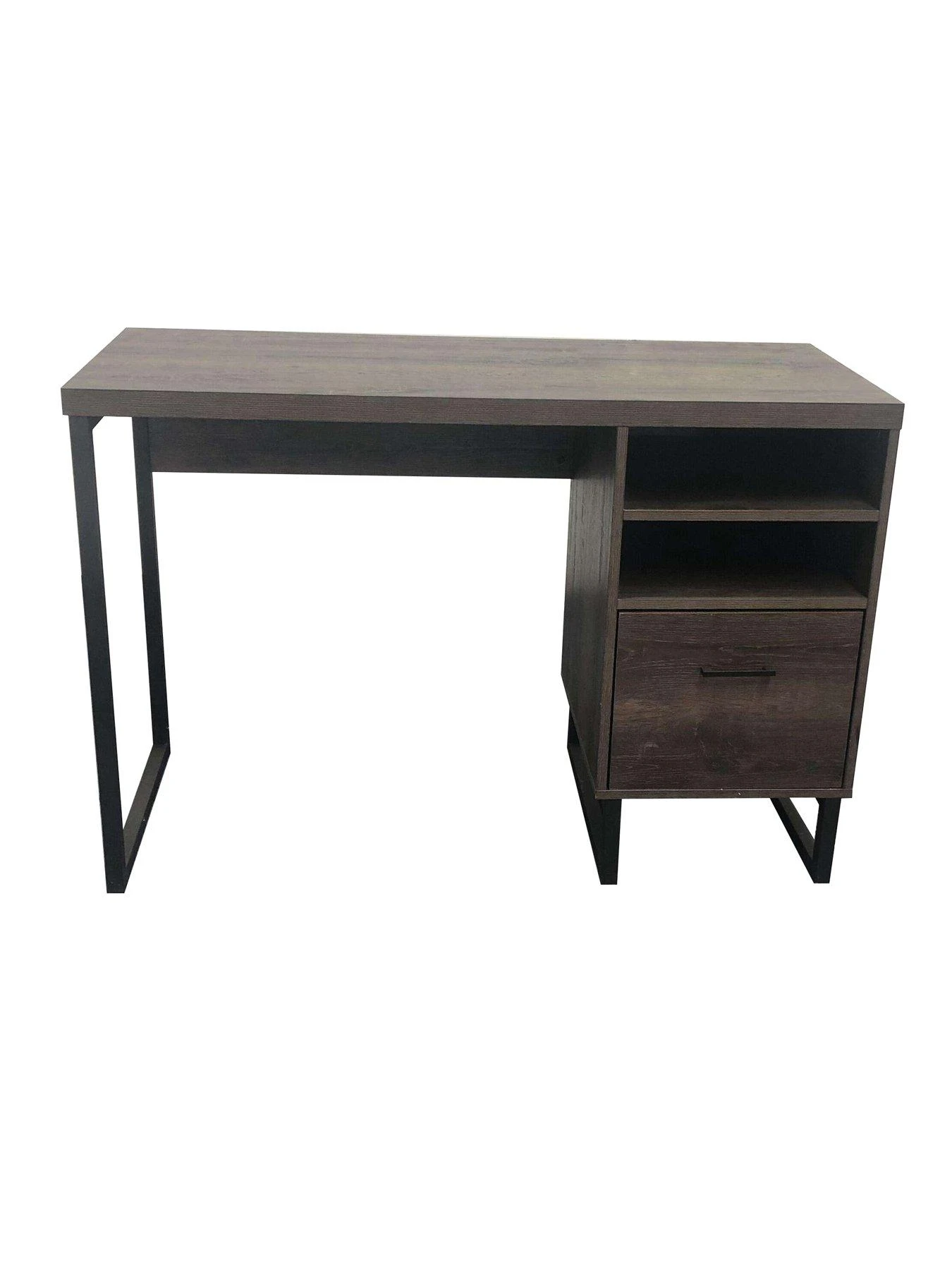 Finished in a richly grained walnut-effect, the whole thing is supported by a sturdy metal frame with a black powder coated finish for a subtle industrial twist. The desktop measures 114 x 49.5 cm – plenty of room for a laptop, books and other work materials. Storage comes from a letter file drawer as well as a pair of open shelves which keep your essentials like stationery close to hand.
