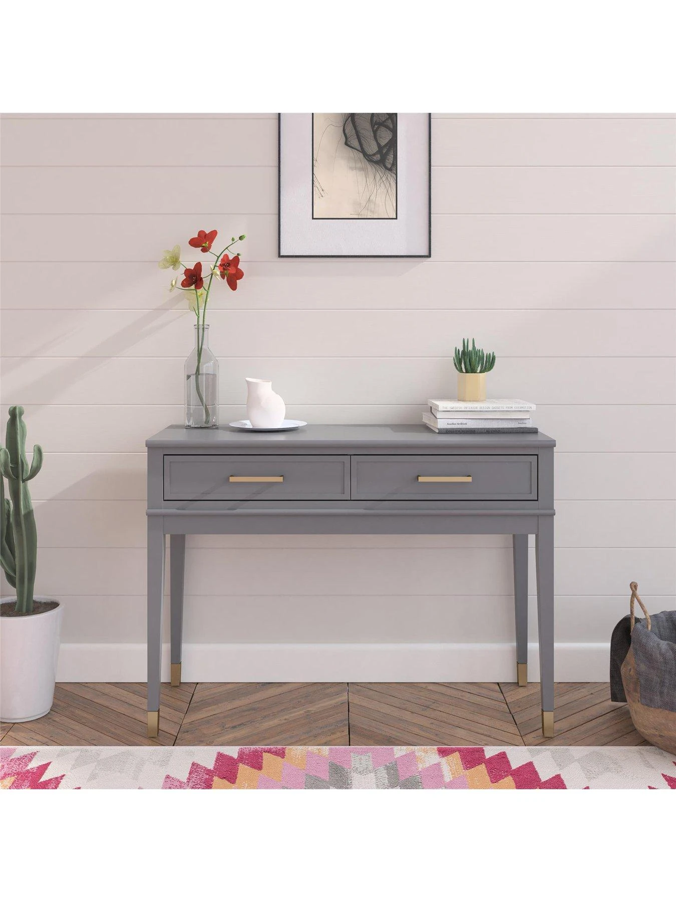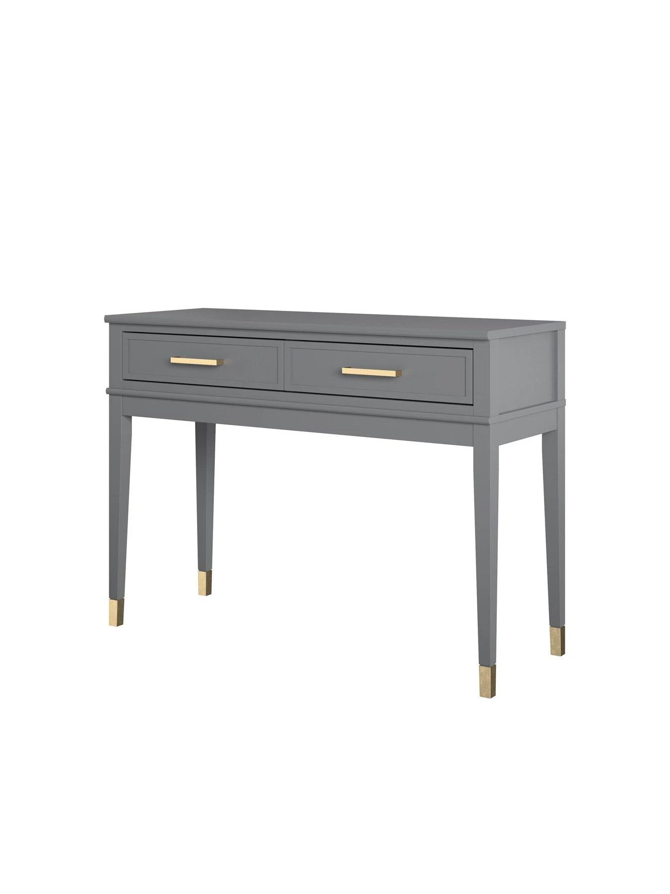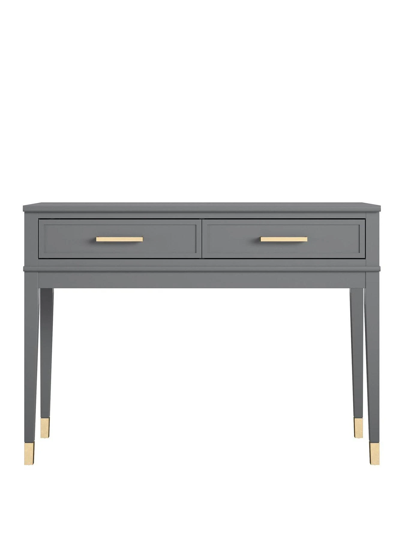 Give your living room a glow up with the CosmoLiving by Cosmopolitan Westerleigh Console Table. Accented by trendy gold hardware and dipped feet, the Westerleigh includes two spacious drawers to hold all of your ~things~. Show off your style using the top to obsessorize while you nail the d????cor game. Available in white, graphite gray, or matte black, this table is a top-notch addition to any home.
