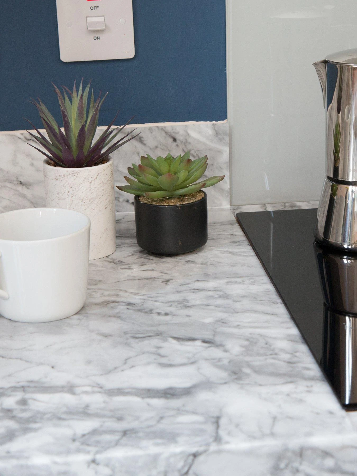 The film is heat resistant to 75C so OK for hot cups and plates, but not hot pans, always use worktop savers to protect the vinyl and keep at least 12 inches away from naked flames – not to be used as a splashback behind hobs. Use sealant around sinks and hobs to make it water tight, a hairdryer can be used on curved edges to make the vinyl more pliable, careful not to stretch it. The film is fully removable, use a hairdryer to soften the adhesive first and warm soapy water to remove any remaining residue. Wipe clean with a regular household cleaner, do not scrub. Wipe up any spillages that may stain straight away eg. curry. If you damage the vinyl, it can easily be removed and replaced with a new piece, if cared for it should last years.