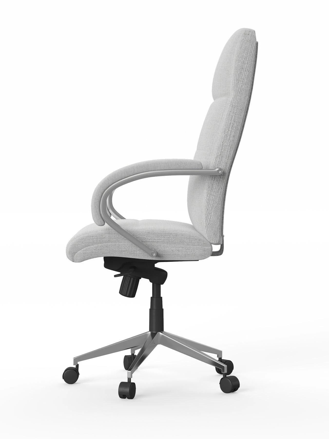 The executive style office chair has a sturdy, supportive design that features a high back and cool curved armrests. It’s wrapped in a textured grey coloured fabric that’s a perfect complement to the cushioned seat, back and arms.