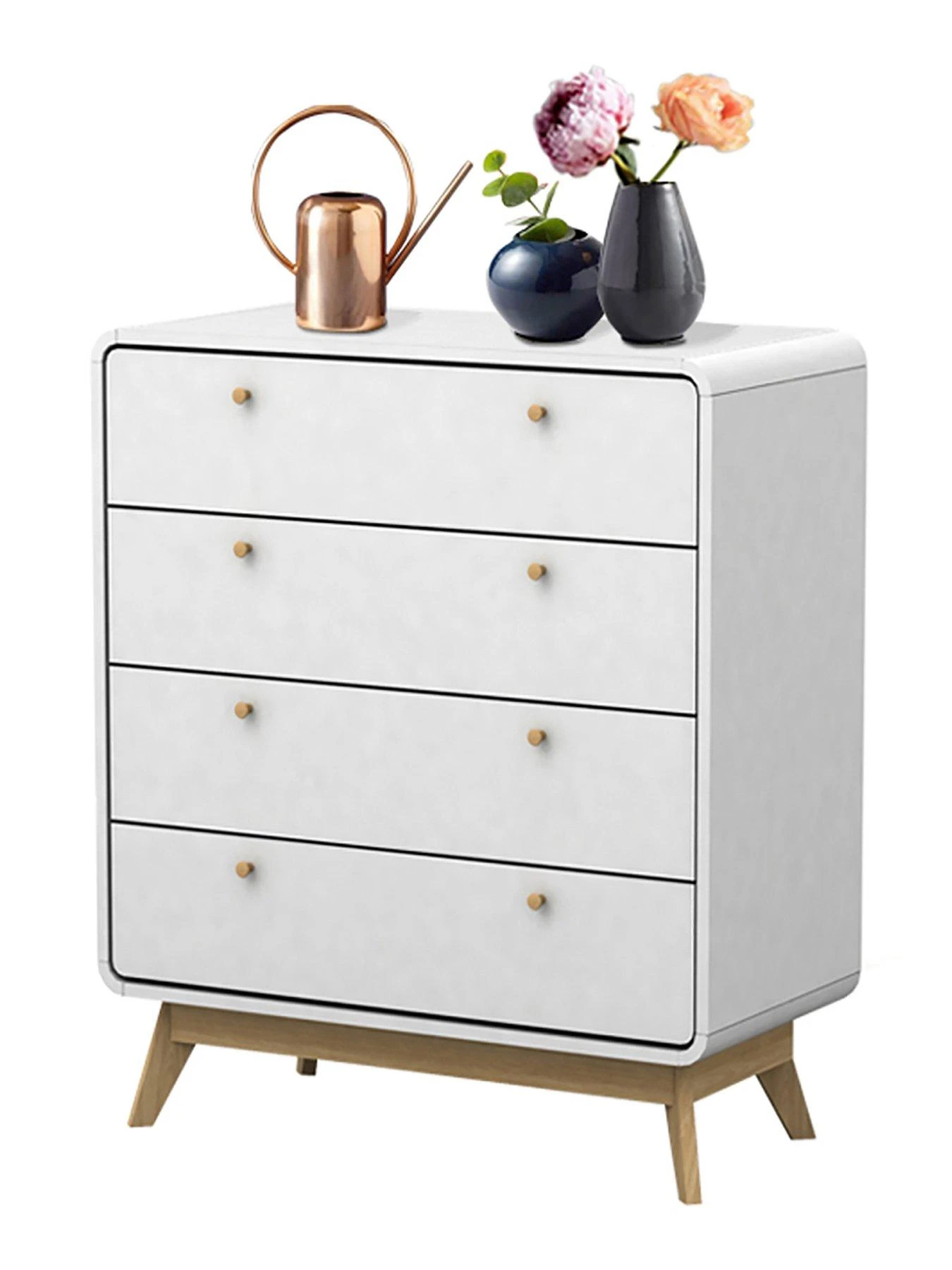 A contrasting oak-effect base is rich in a realistic grain pattern, while splayed feet give it the eye-catching Scandinavian vibe and raise it off the floor. Four drawers are accented with dainty oak knob handles and glide smoothly open with a minimum of friction or noise on the metal rail runners.