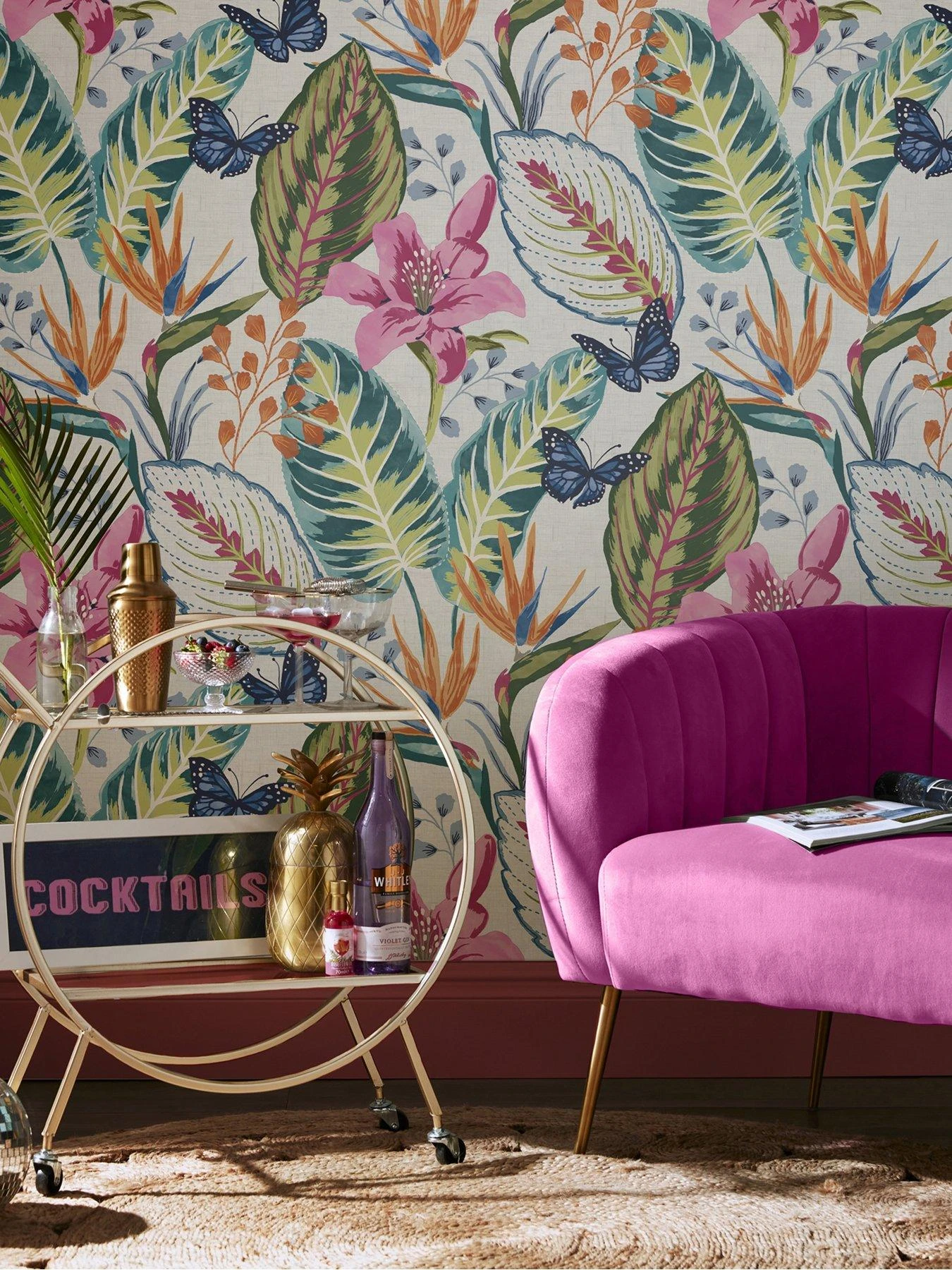 The fresh white canvas is a perfect starting point for the totally on-trend print featuring tropical florals, bird of paradise plants, and flurries of butterflies in vivid shades of green, blue, orange, pink and more. This bursting kaleidoscope of colour makes it perfect for feature walls – trying brightening your lounge or bedroom and tying together with some simple neutrals.