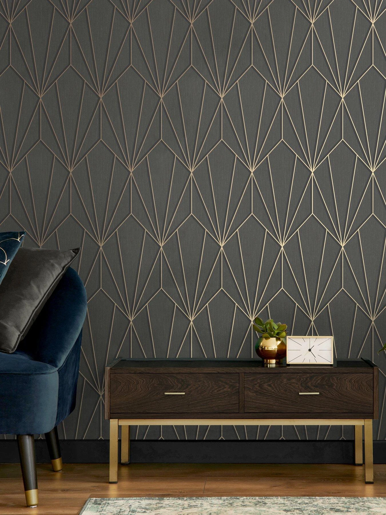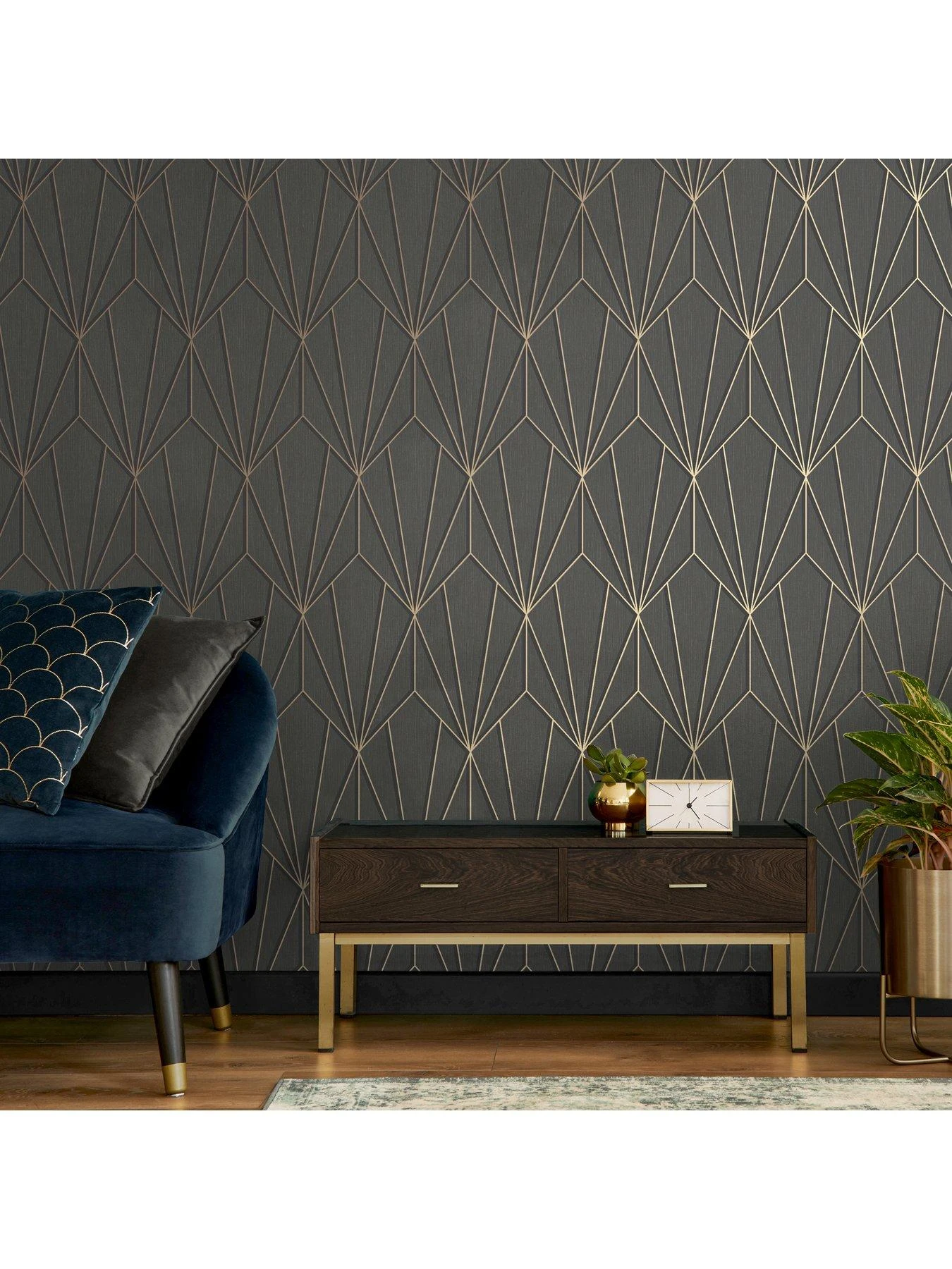 A contemporary geometric design with metallic detailing and shadow effect creates a stunning large scale three dimensional illusion on the wall. With a colour scheme of charcoal and copper and a subtle shimmering effect in the background this wallpaper is suitable for all living areas within the home and will add a statement to any wall.