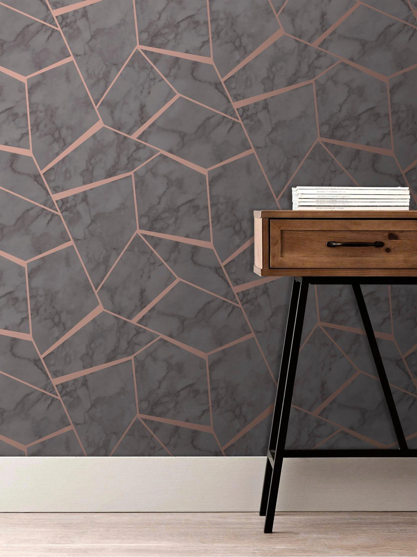 Perfect for creating a feature wall, this marble inspired wallpaper has a chic charcoal grey hue. Metallic copper details create a dazzling geometric design.