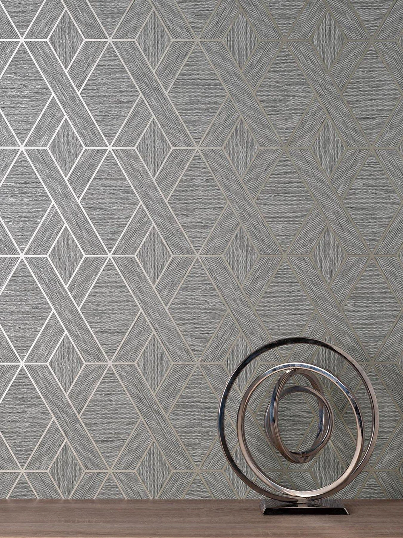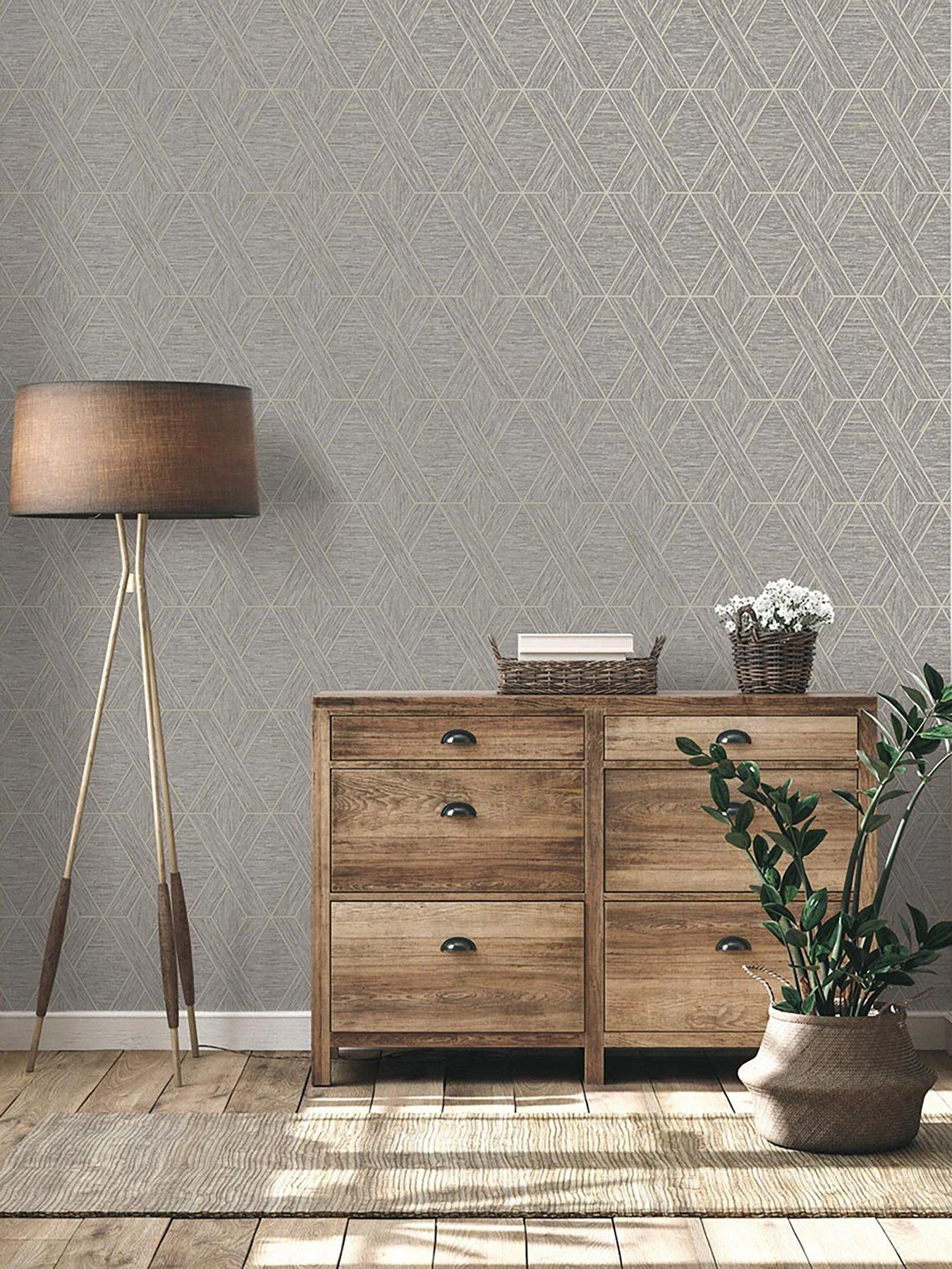 In a neutral grey colourway, the blown vinyl paper creates a truly distinctive visual effect as directional grasscloth-effect textures are arranged into a geometric trellis. Metallic detailing adds a shimmering pop, as well as a subtle sense of depth to the look. This unique combination of elements helps to build a striking finish that’s just as effective hung all around the room as it is when used as a feature wall focal point.