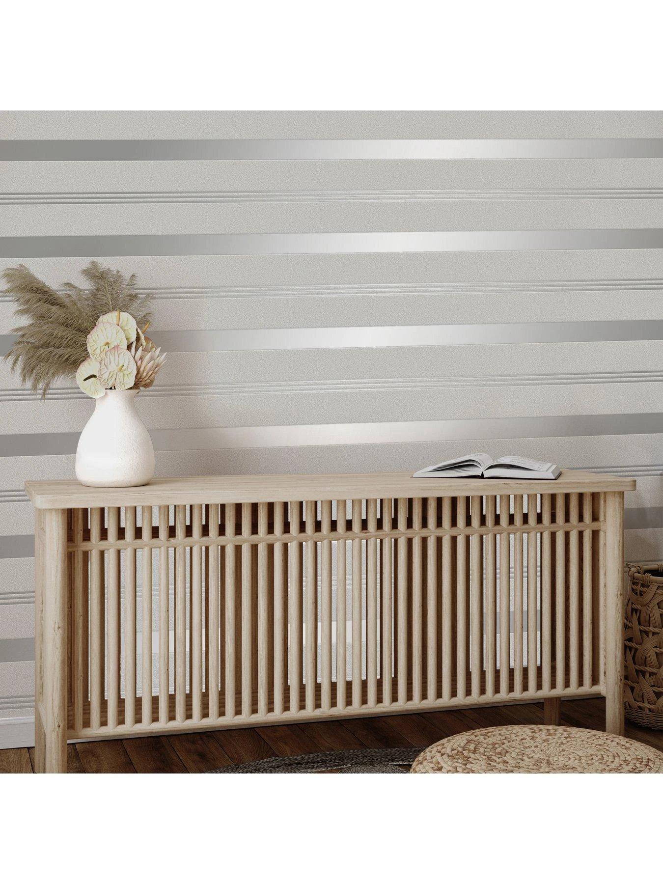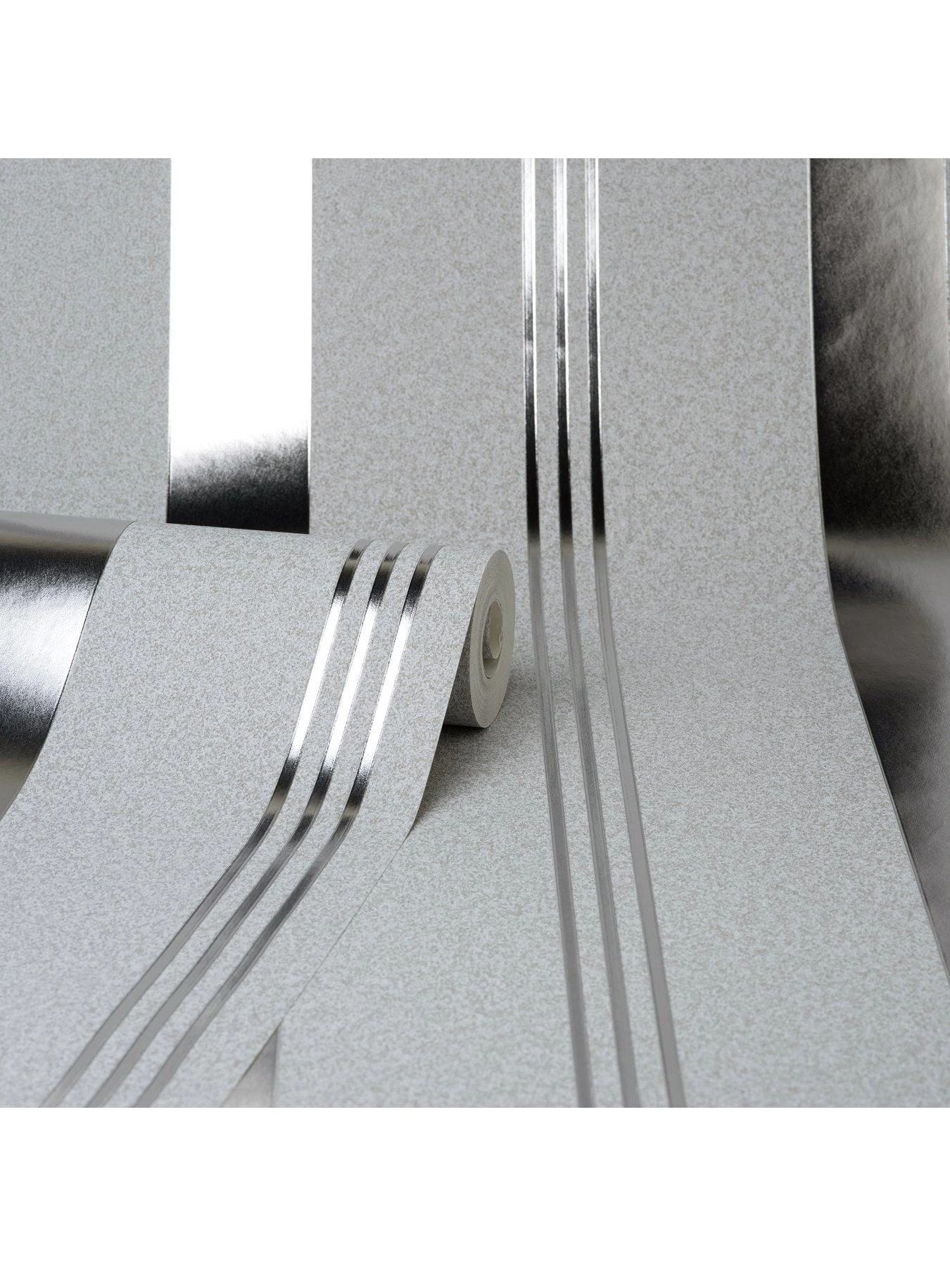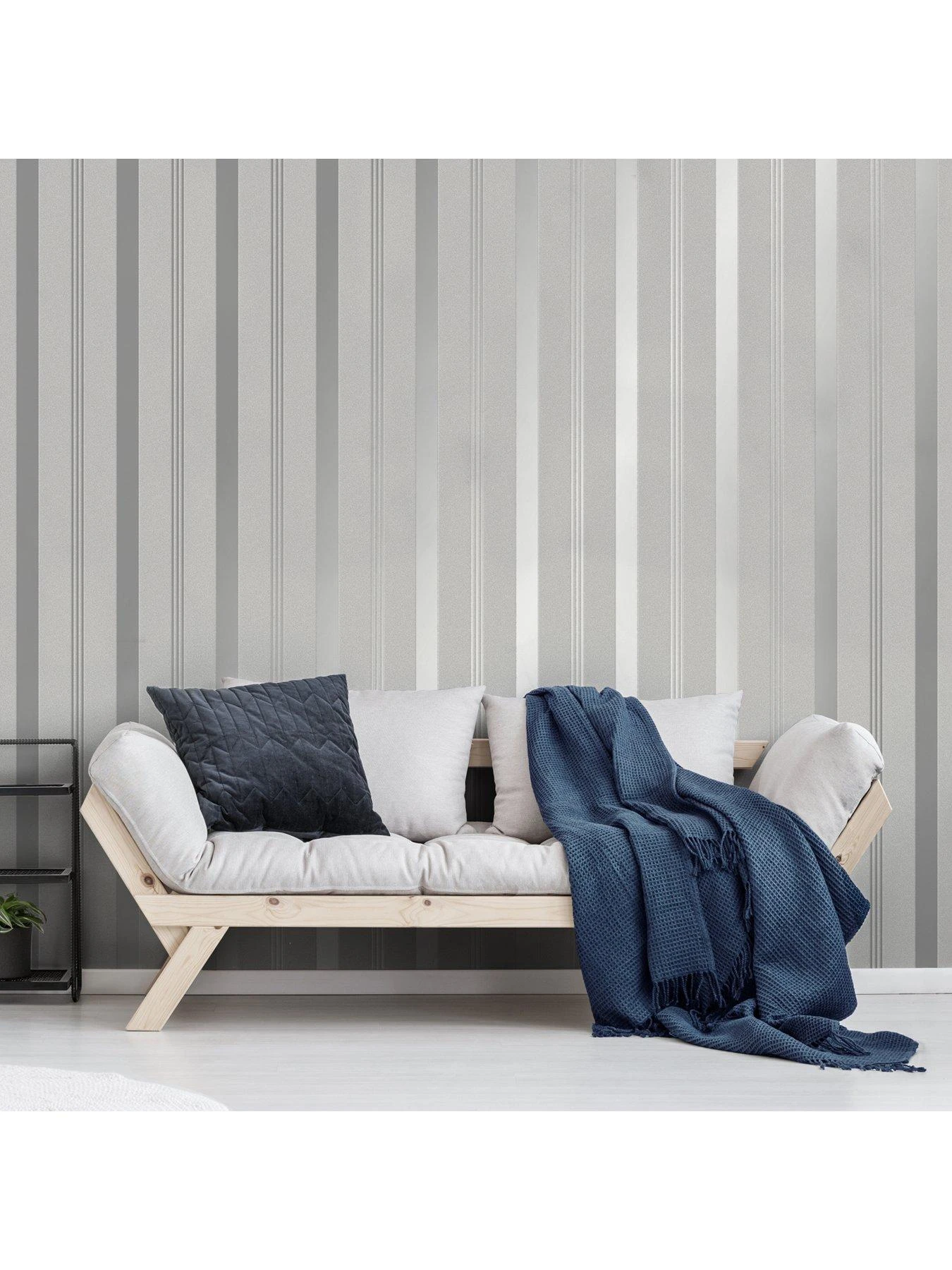 Bexley Stripe is an eye catching classic stripe in a high shine metallic foil finish on a textured matt backdrop. This luxurious vinyl wallpaper whilst oozing sophistication and opulence also has the added benefit of being durable. Featured in a timeless Grey and Silver colour scheme Bexley will add a dazzling statement to any room and can be hung vertical or horizontal to create different looks within the home.