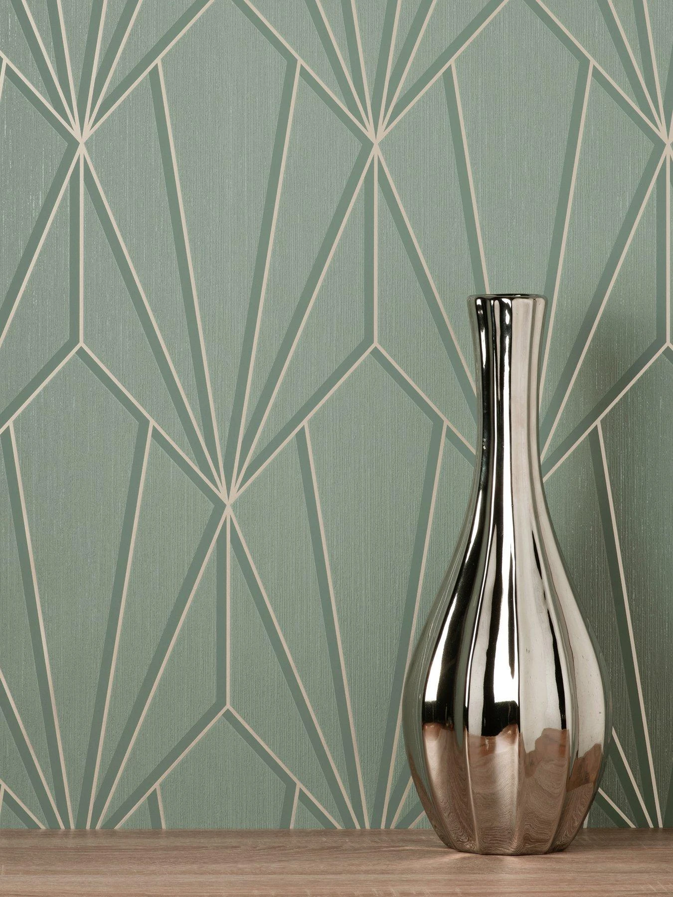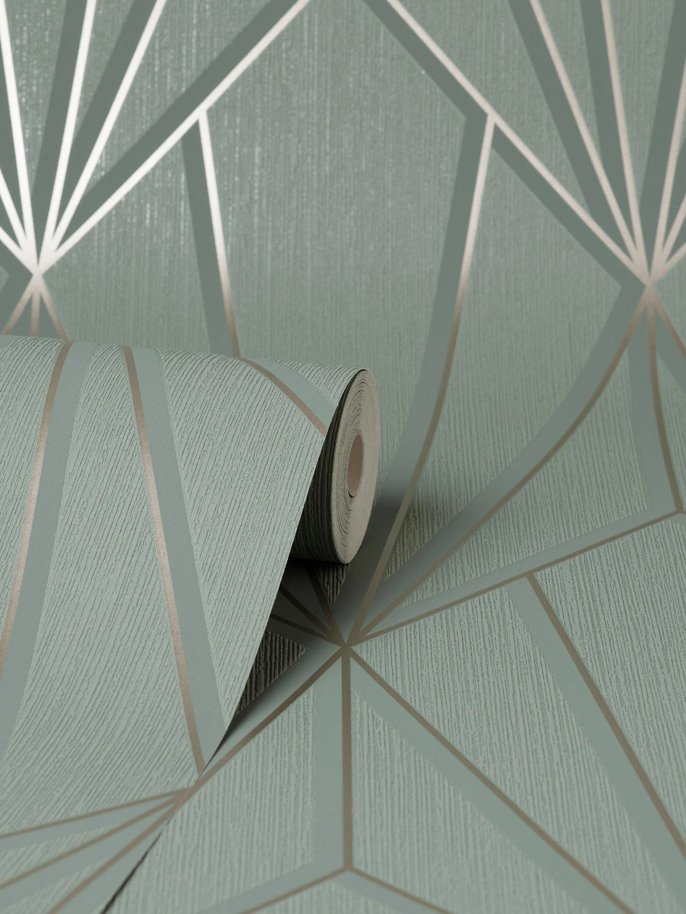 A contemporary geometric design with metallic detailing and shadow effect creates a stunning large scale three dimensional illusion on the wall. With a colour scheme of sage and gilver and a subtle shimmering effect in the background this wallpaper is suitable for all living areas within the home and will add a statement to any wall.