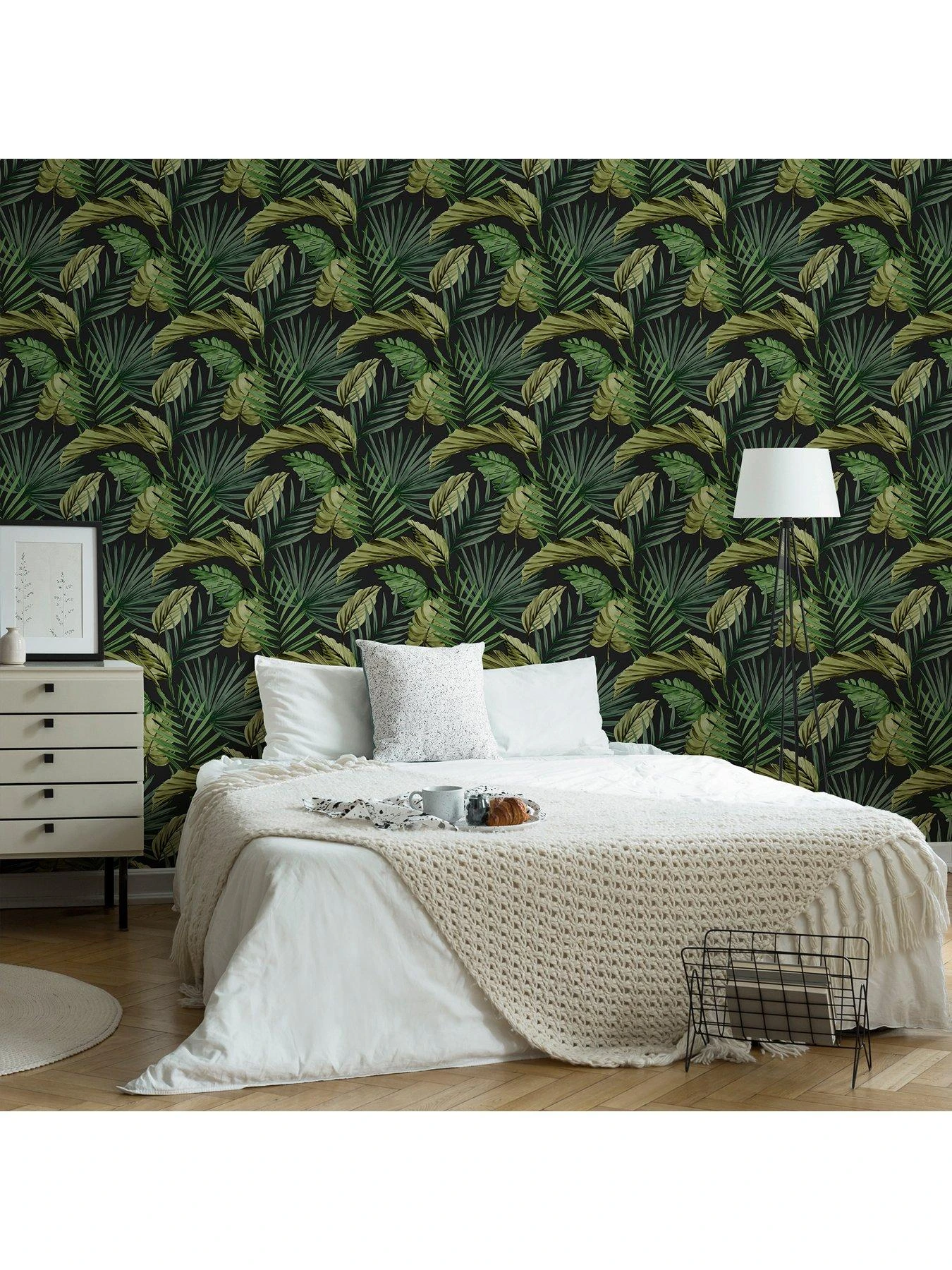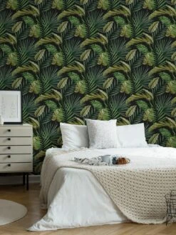 Extend a contemporary edge to your walls with the Fresco room set. This wallpaper comes in a tropical palm house tress in a multifarious collection against a bold green backdrop. The dark and moody theme efficiently creates a tranquil range of vision