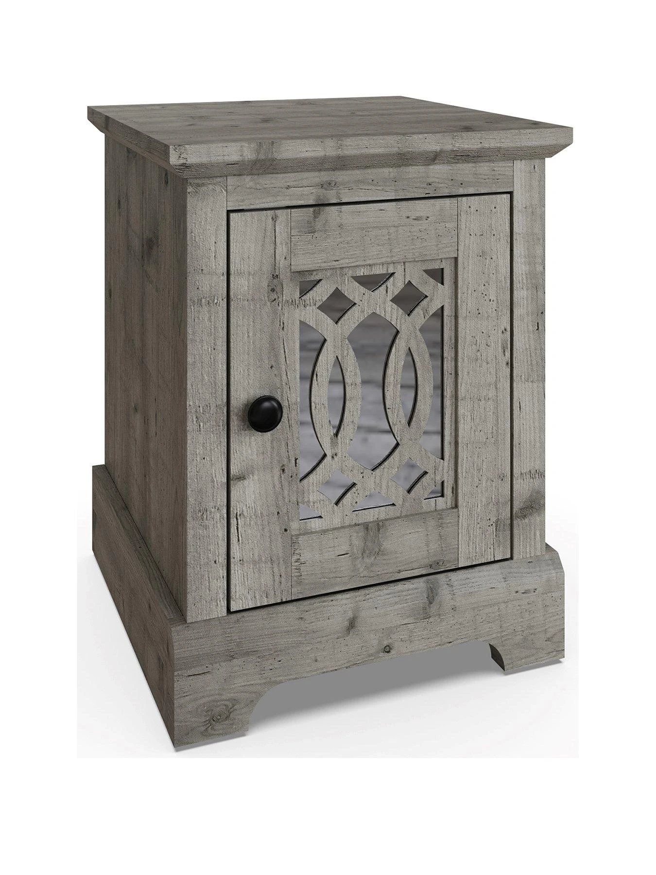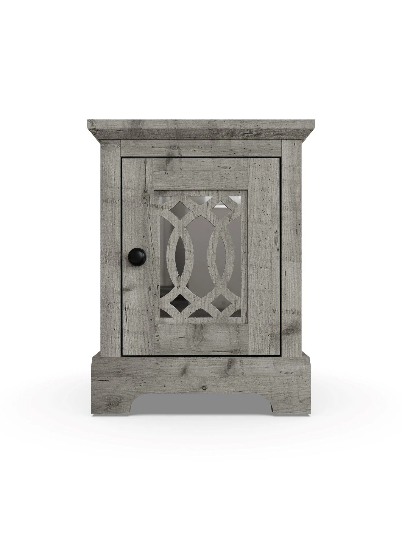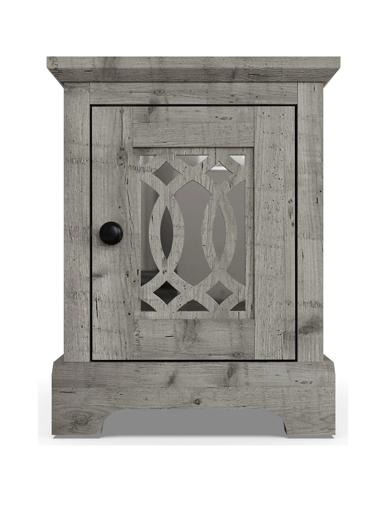 In a choice of realistically grained grey or light grey wood-effects, it features a chunky design with a deep plinth and waterfall edged top. The star of the show is a statement-making single door with laser cut fretwork panelling that’s backed by a shiny mirror.