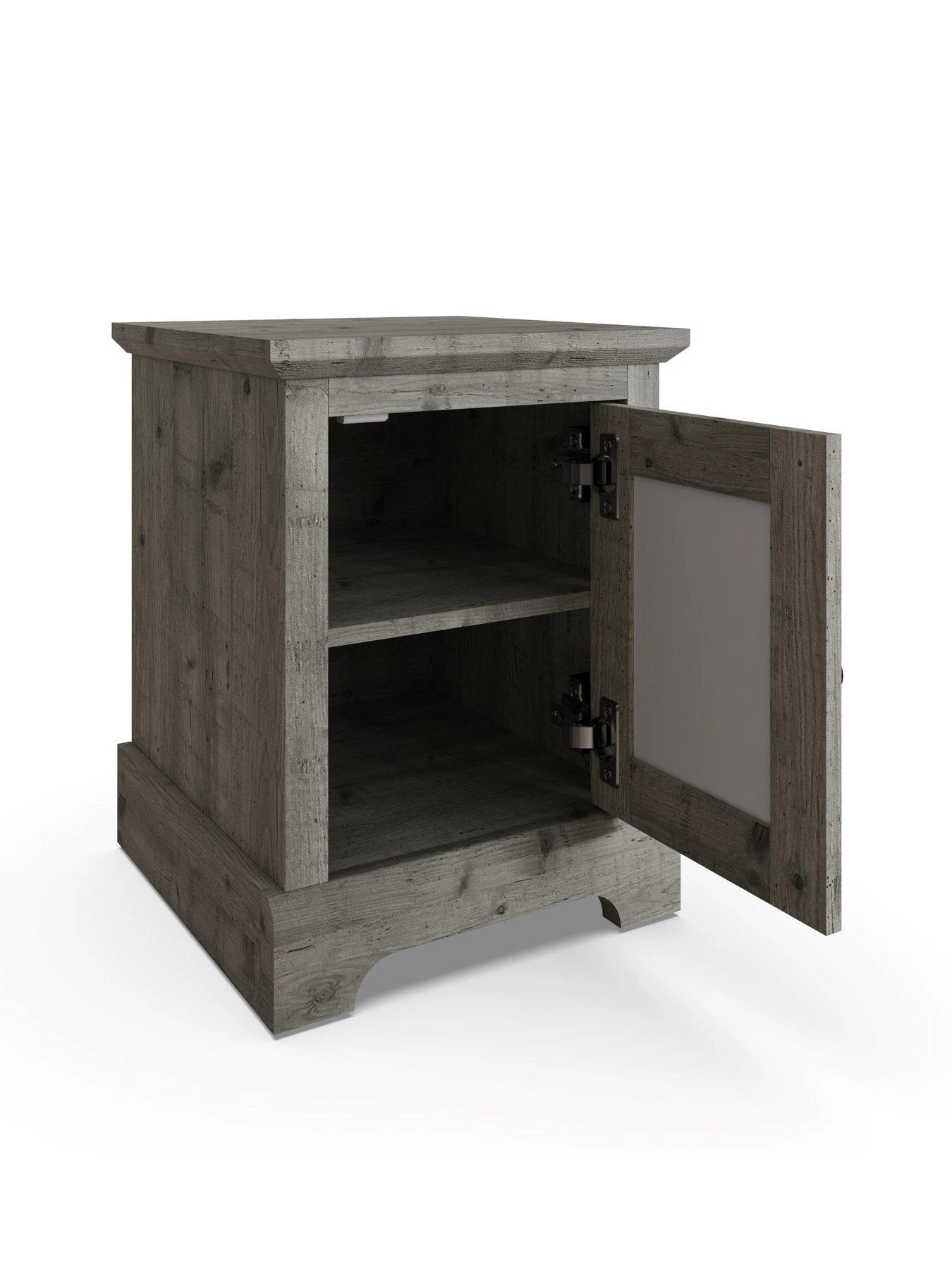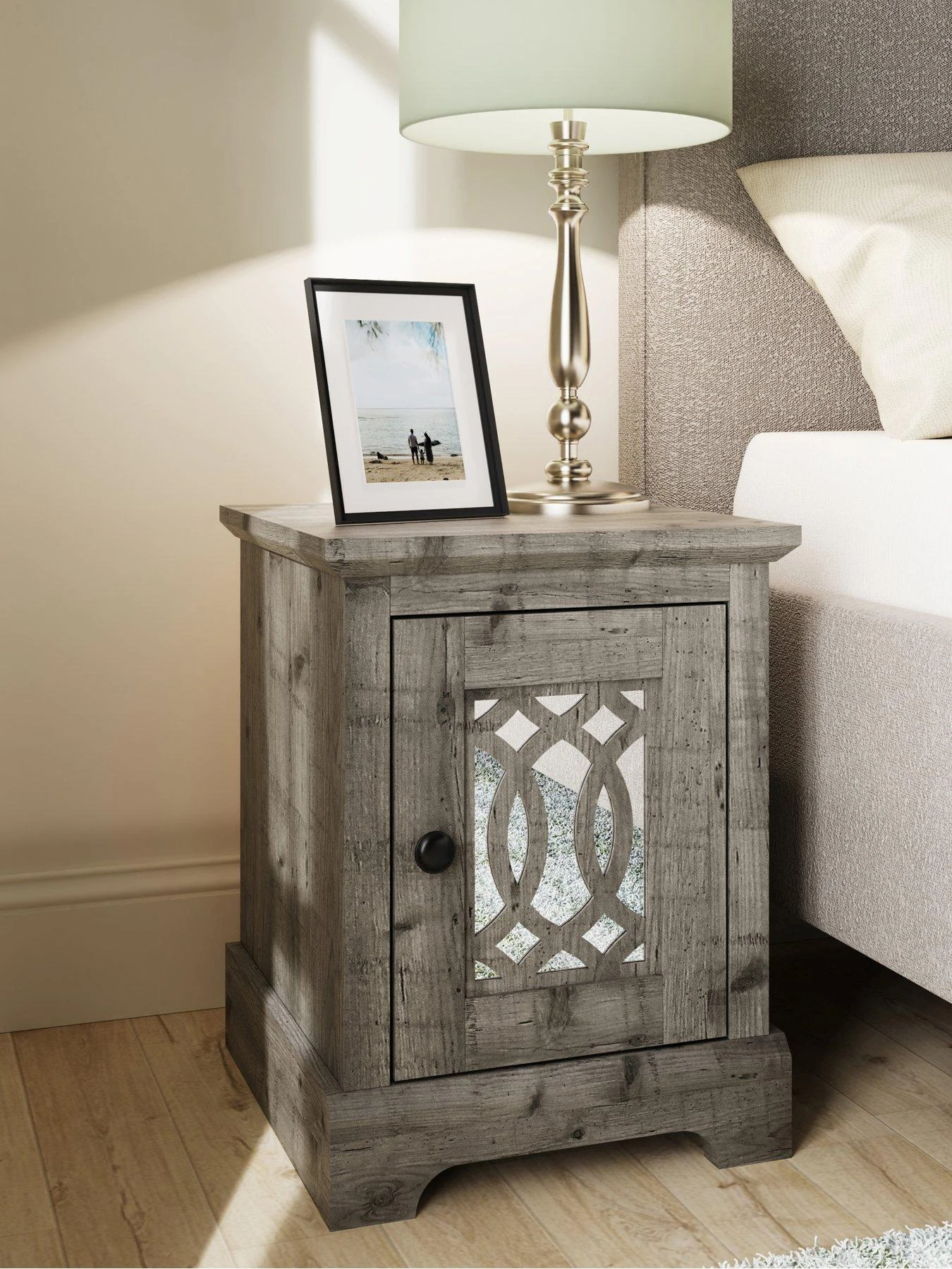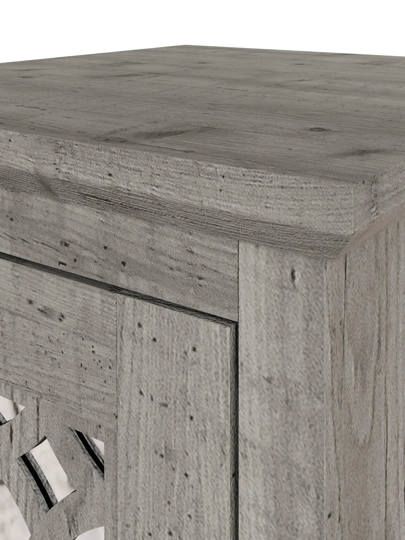 In a choice of realistically grained grey or light grey wood-effects, it features a chunky design with a deep plinth and waterfall edged top. The star of the show is a statement-making single door with laser cut fretwork panelling that’s backed by a shiny mirror.