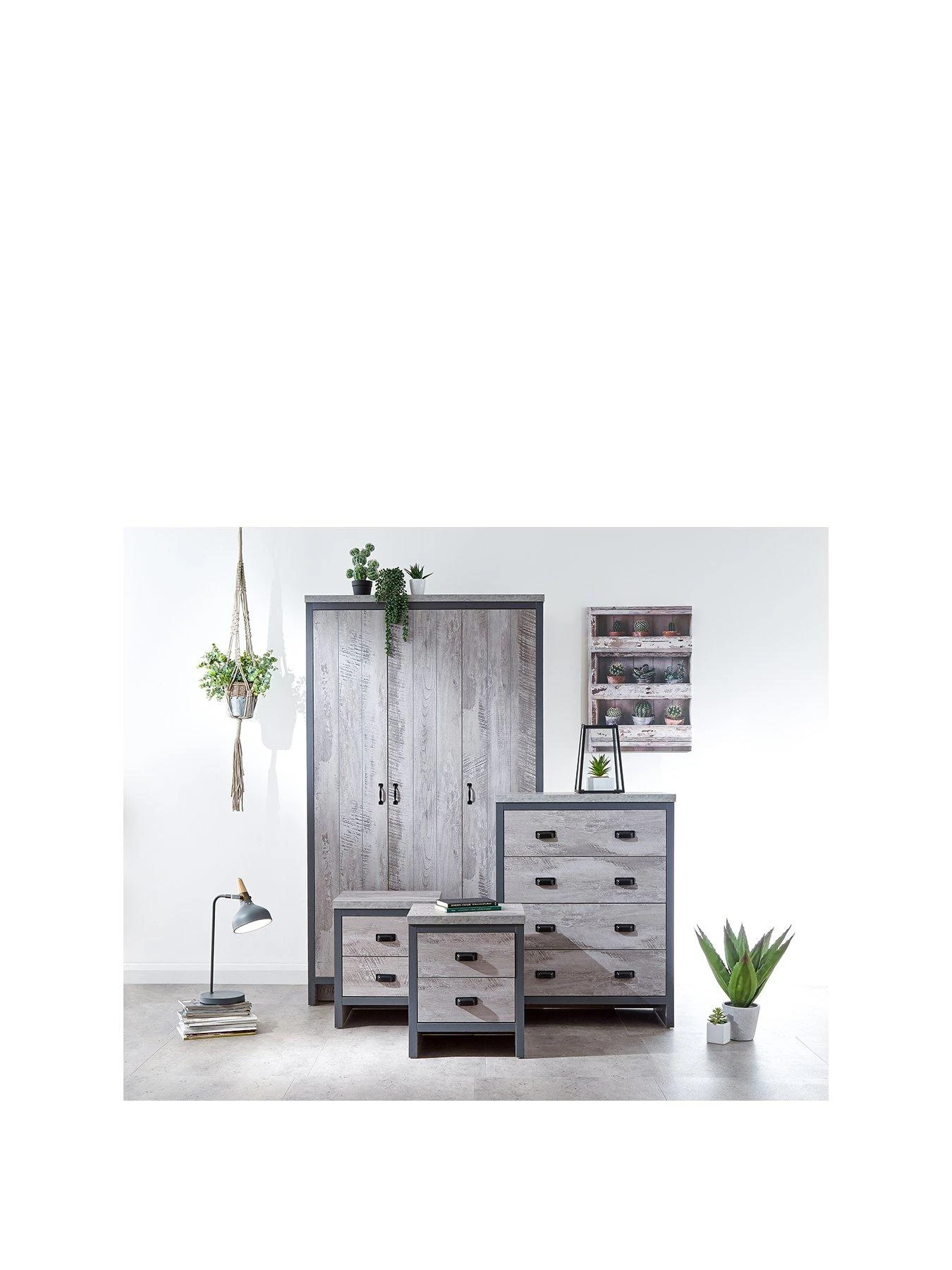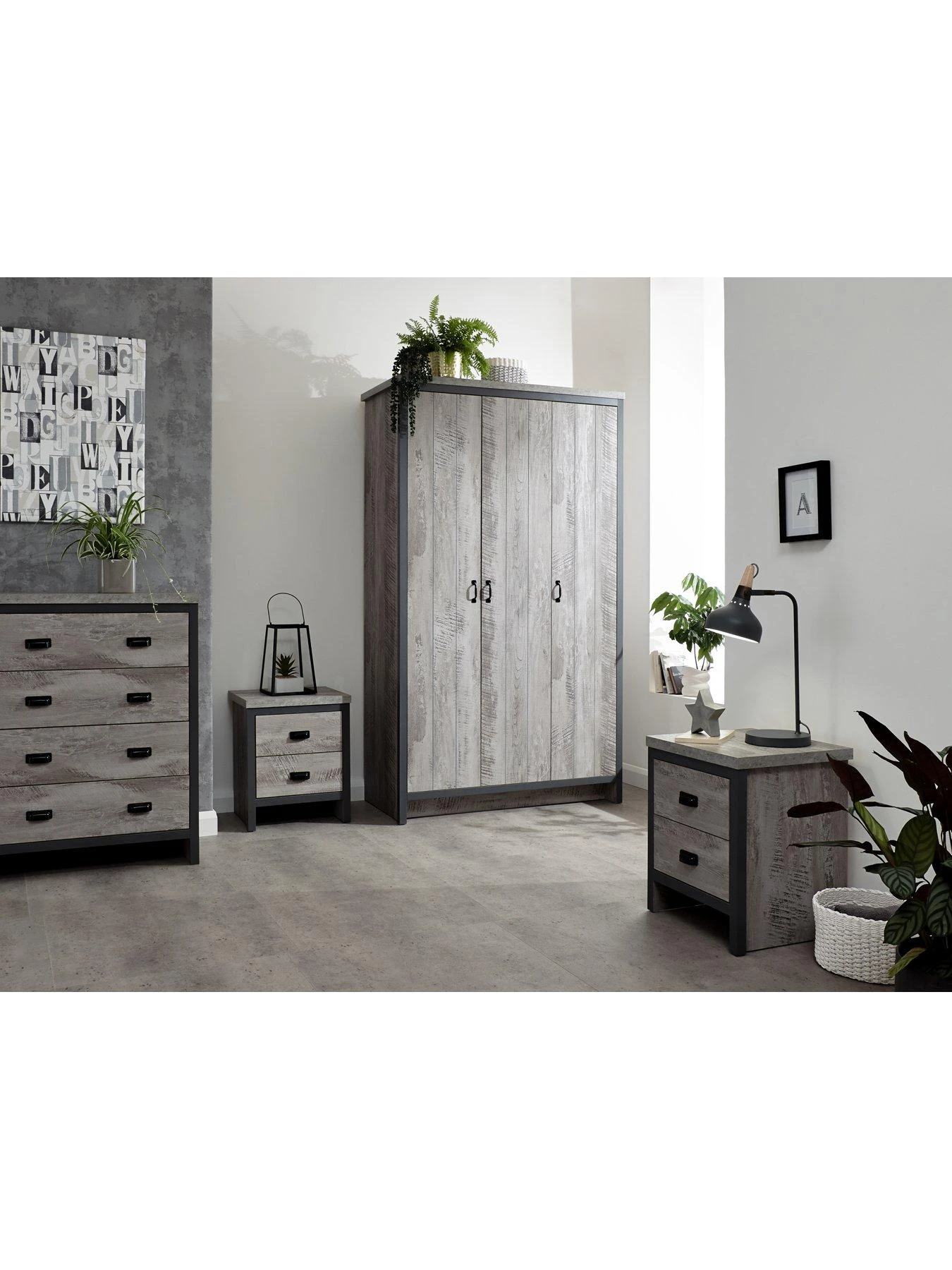 This 4 Piece Bedroom Furniture Set from GFW’s Boston Collection comprises a 3 Door Wardrobe, Chest of 4 Drawers plus a pair of 2 Drawer Bedside Chests – Grey