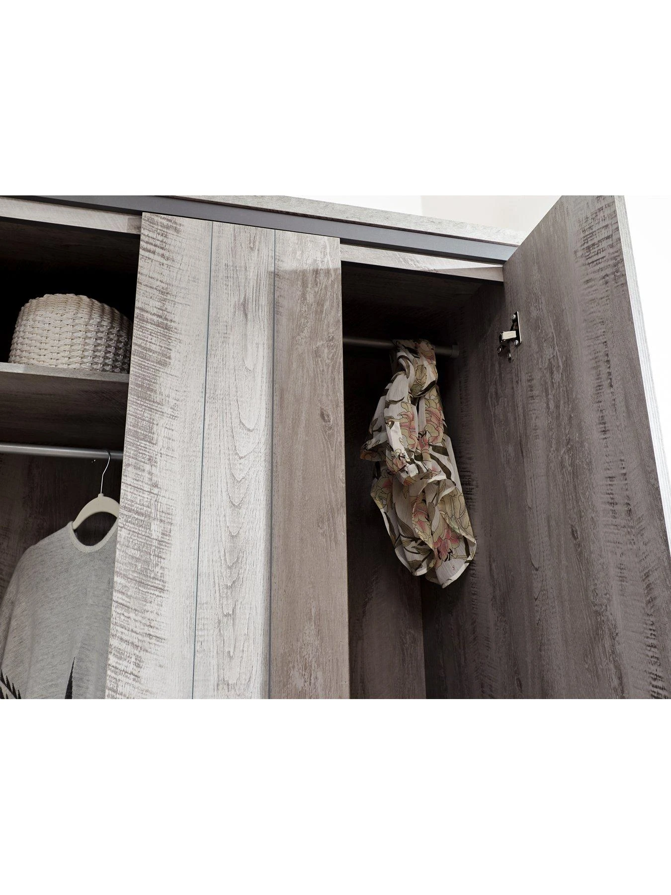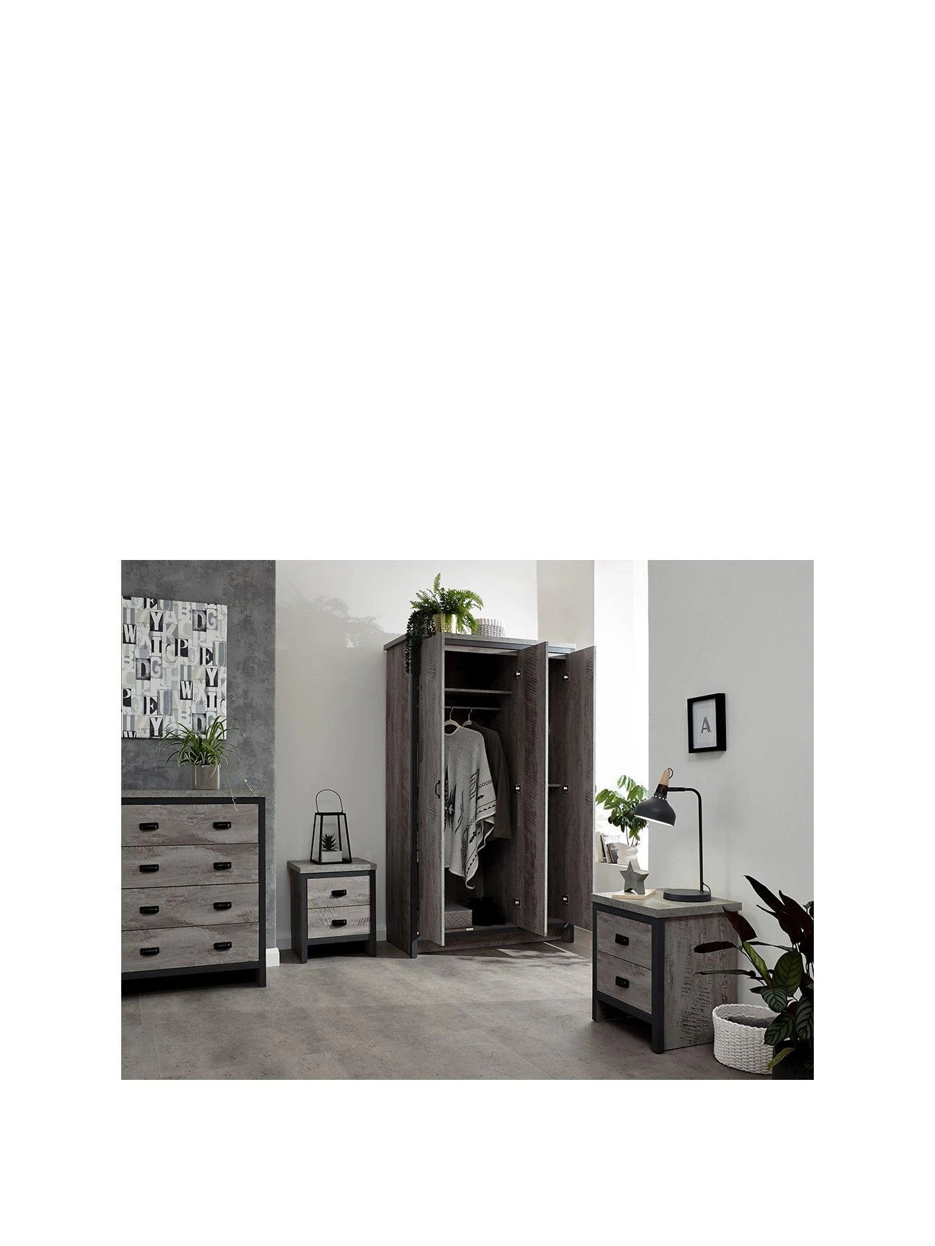 A 3 door wardrobe contains tall hanging space, plus plenty of shelves for shoes, folded fashion or storage baskets. All drawers benefit from supports for increased load weight, and all the furniture is finished with black metal handles for a final touch of modern style.