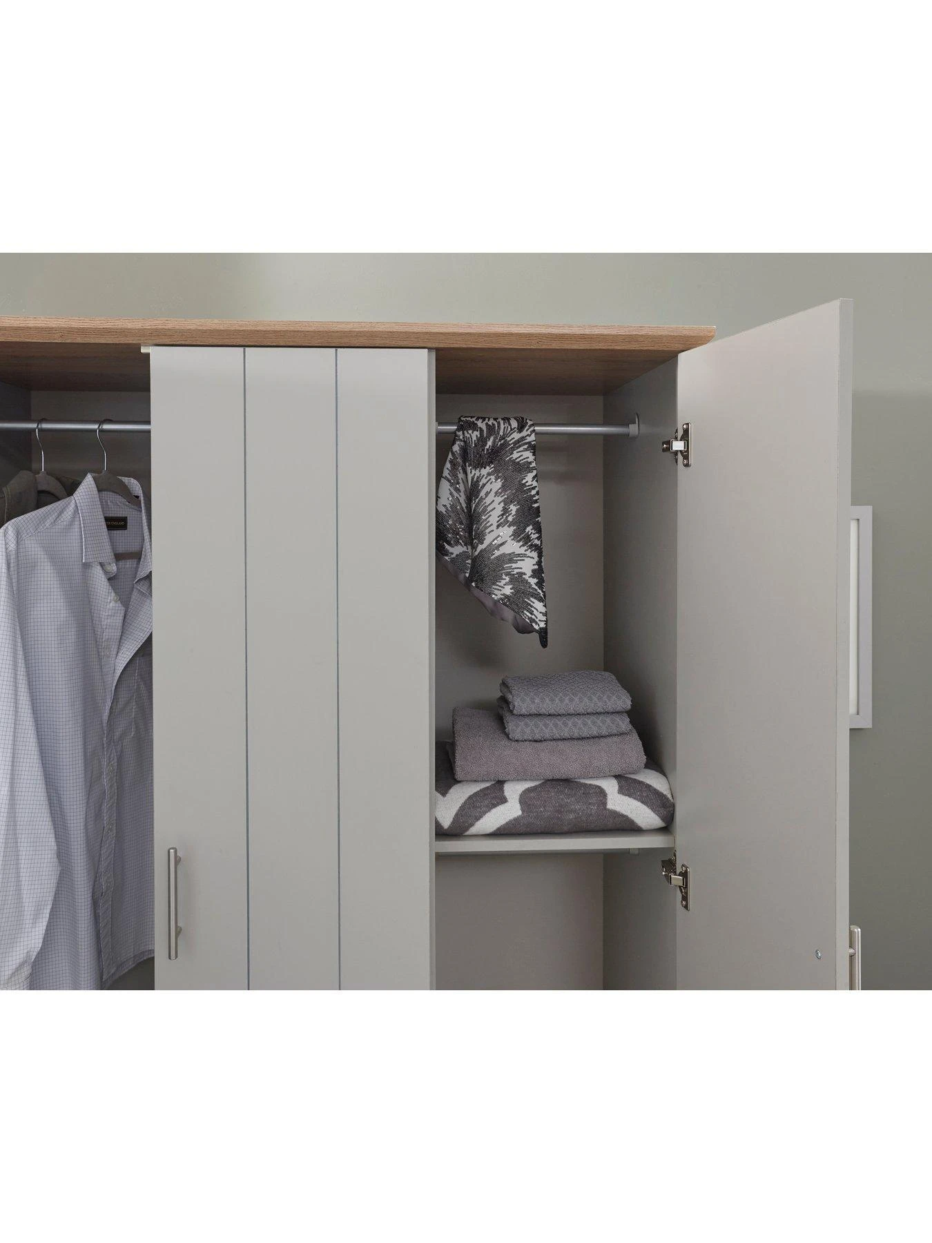 Three doors have a panel style design and are finished with curved brushed steel metal handles. Inside there is a metal hanging rail behind the double doors, plus a rail for smaller items behind the single door, plus a series of shelves for folded tees, towels and more.
