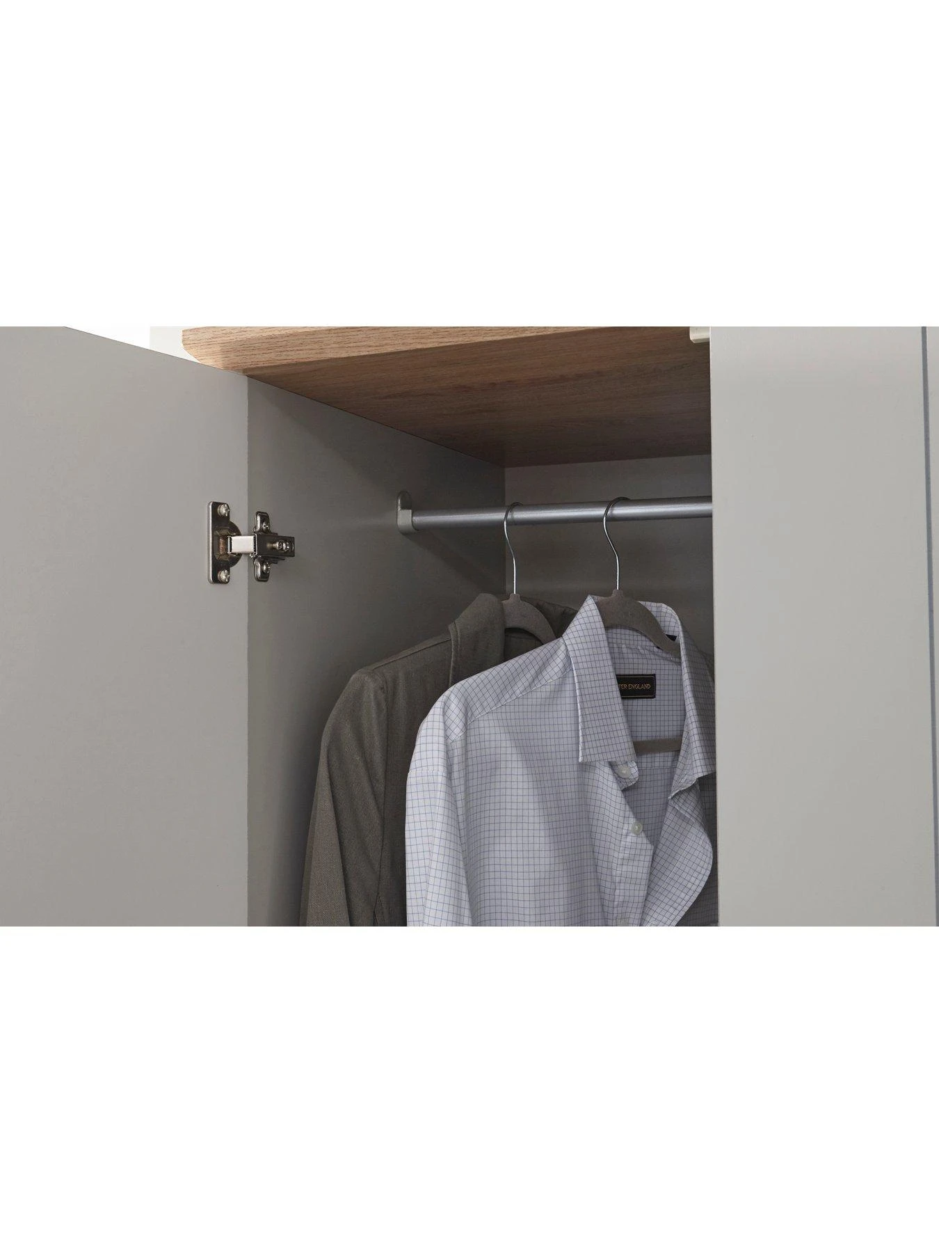 Part of the Kendal collection of bedroom furniture, this large wardrobe comes in a smooth grey finish and features a contrasting oak-effect top with a bevelled edge.