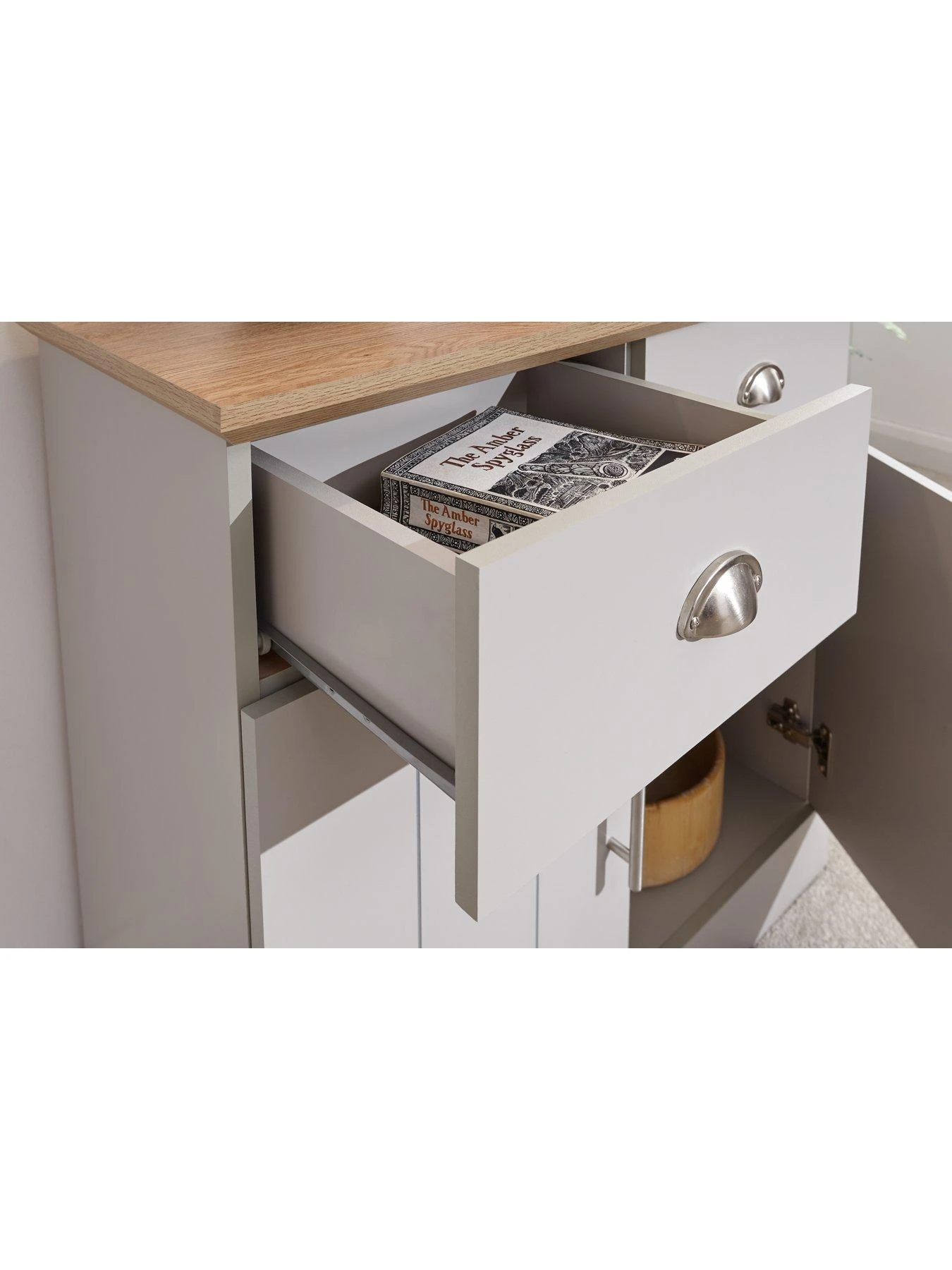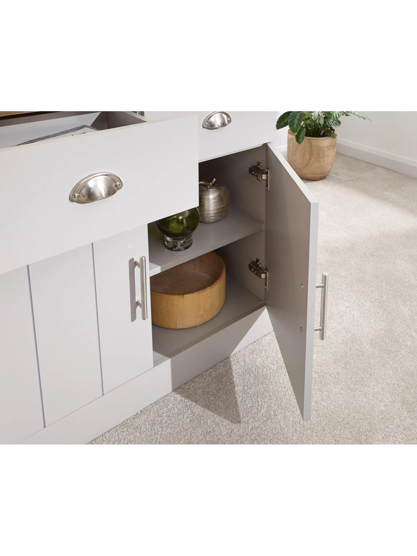 Groove panelled doors are fitted with brushed satin bar handles, while the drawers are accented with cup handles. An adjustable shelf allows customisable storage, and extra organisation comes from the two drawers that glide open and closed on metal runners.