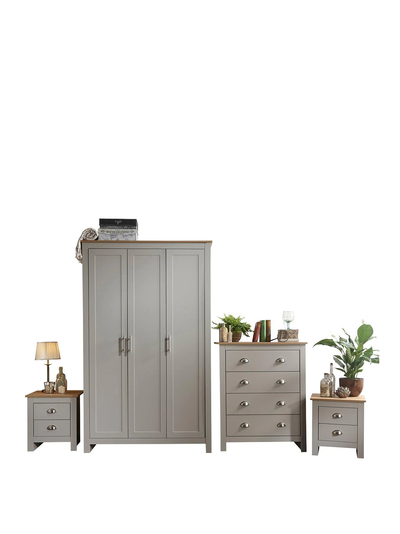 This great value 4 Piece Lancaster Bedroom furniture set by GFW comprises a 3 Door Wardrobe, 4 Drawer Chest and 2 Bedside Chests – Grey, Slate Blue or Cream
