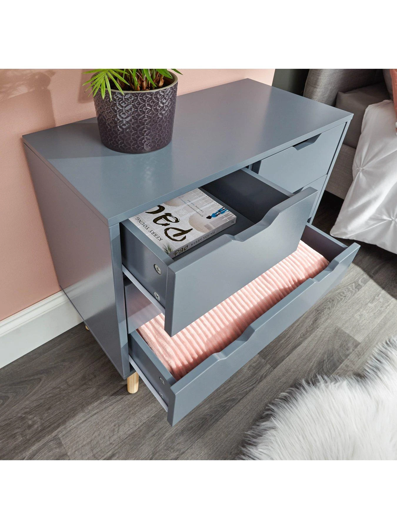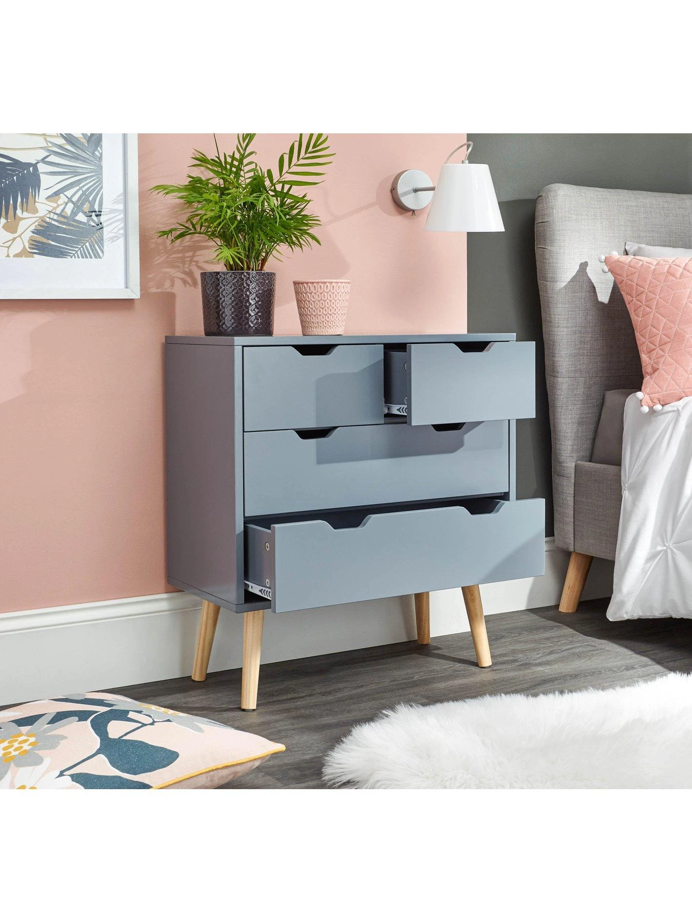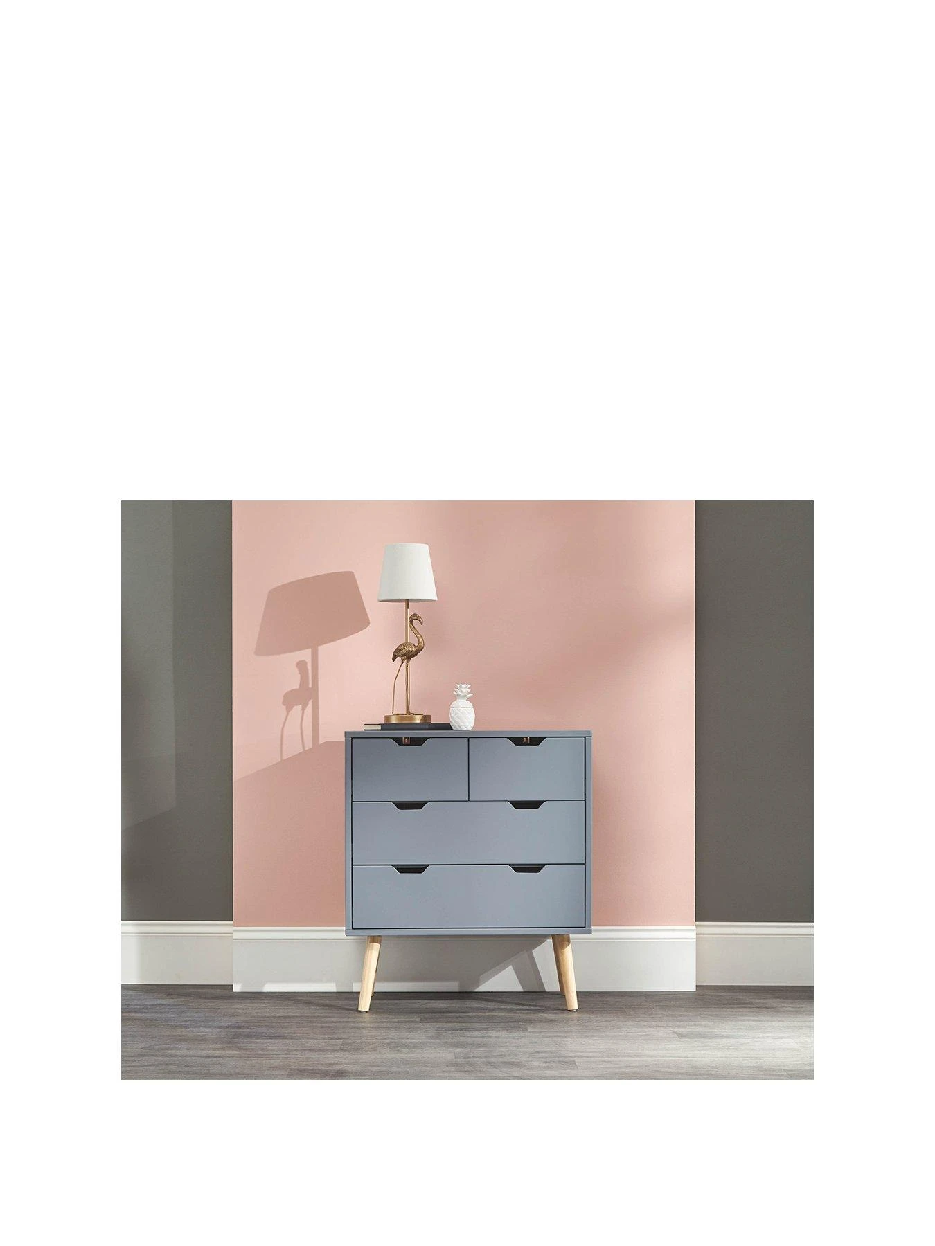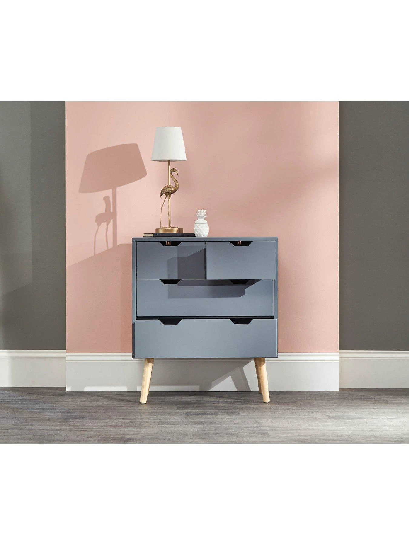 Transform your bedroom with a classic 4-drawer chest in a modern Scandi design that’s ideal for a style-conscious contemporary space. The simple construction offers two full-width and two half-width drawers, each with neat cut-out handles. The smooth painted finish is available in a selection of on-trend colours – including the new season’s warm pink, soft green and ink blue shades – and mounted on slender mid-century-inspired pale-wood legs. A timeless choice.