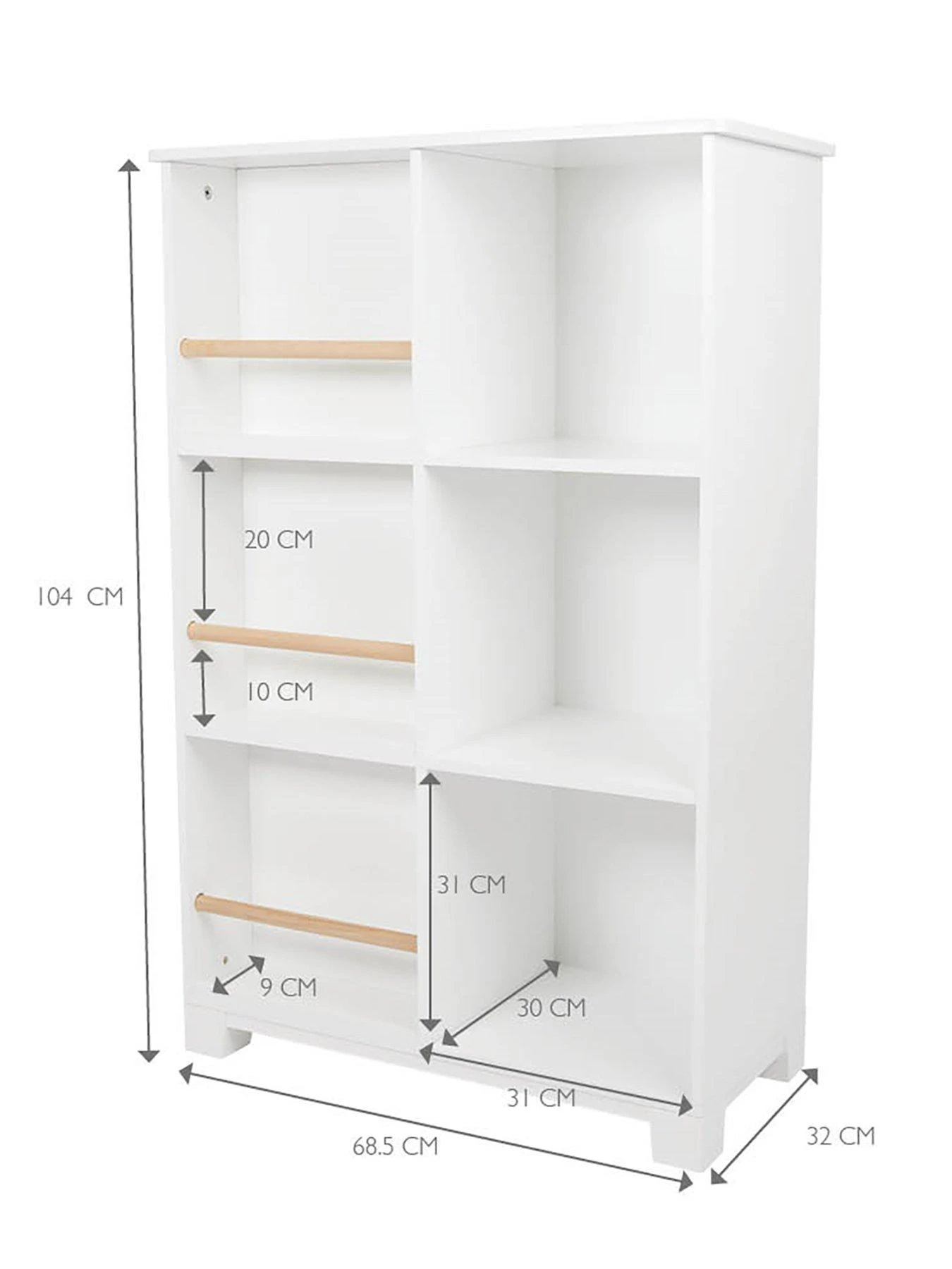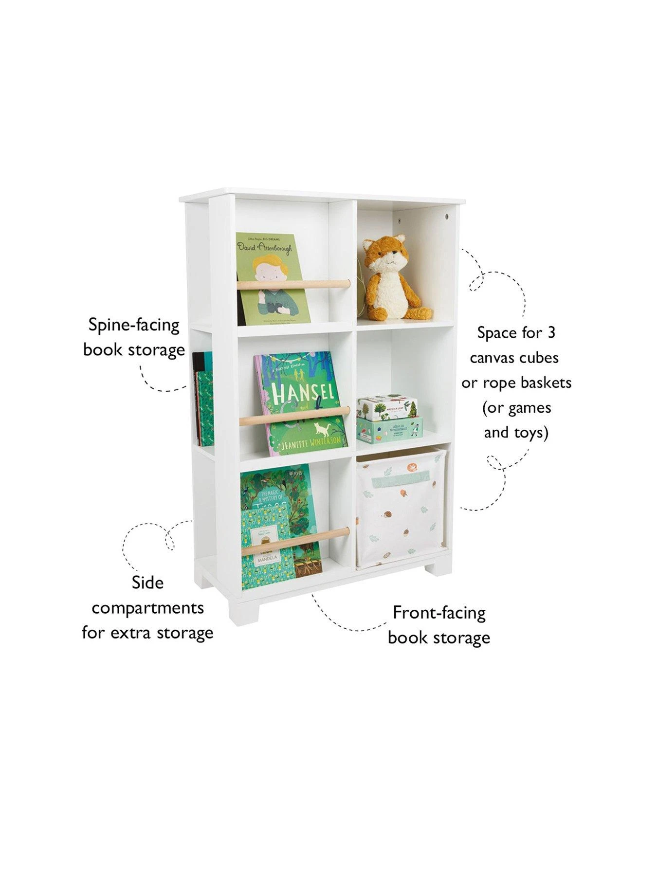 In a fresh white painted finish, the front features three shelves that provide front-facing storage for books so they can show off their favourite book covers and the contrasting wooden cross sections prevent the books from falling off the shelf.