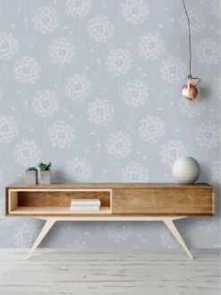 In a calming blue shade, the luxurious heavyweight Italian vinyl paper is brought to life by stylised embellished dandelion flowers, complete with a shimmering bead-effect centre and stem. The main motif is slightly raised above the woven-effect backdrop, leading to a subtle sense of depth that’s effortlessly sophisticated.