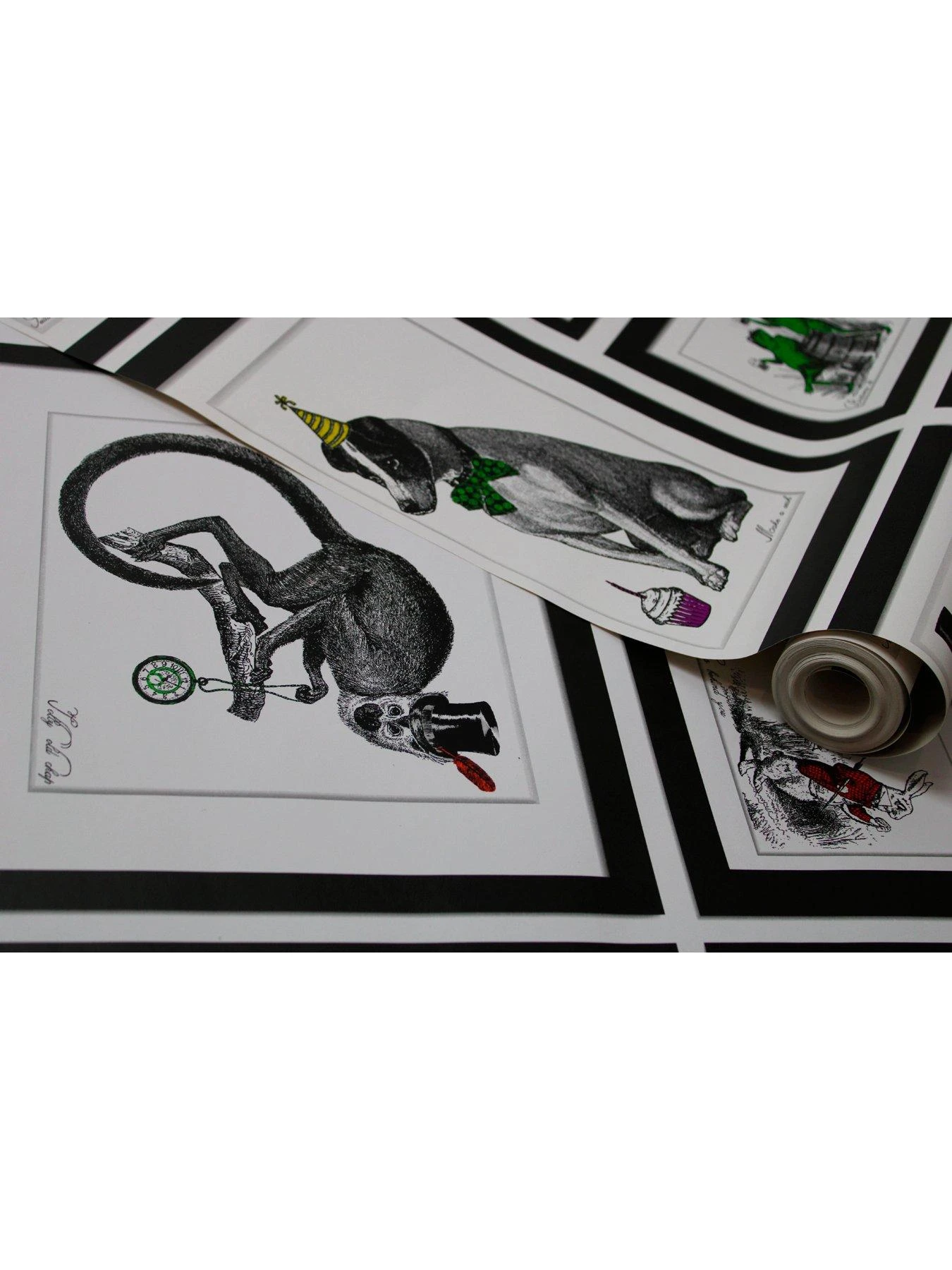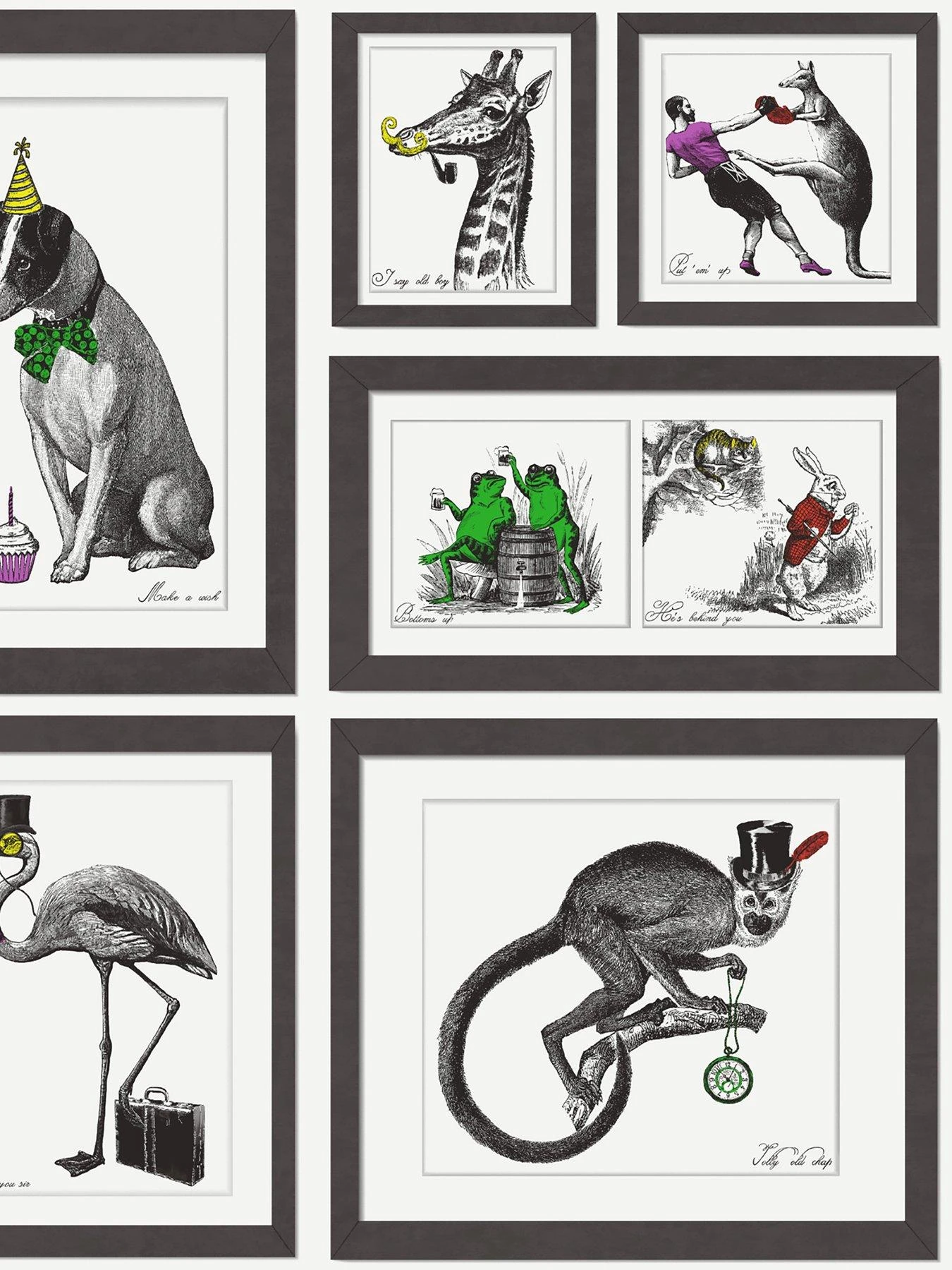A quirky collection of framed illustrated animals in a variety of human set ups, featuring quotes under each. This design is predominantly black and white with vibrant splashes of accent colours. Made with high-quality materials and easy to install, this wallpaper will give any space a unique character.