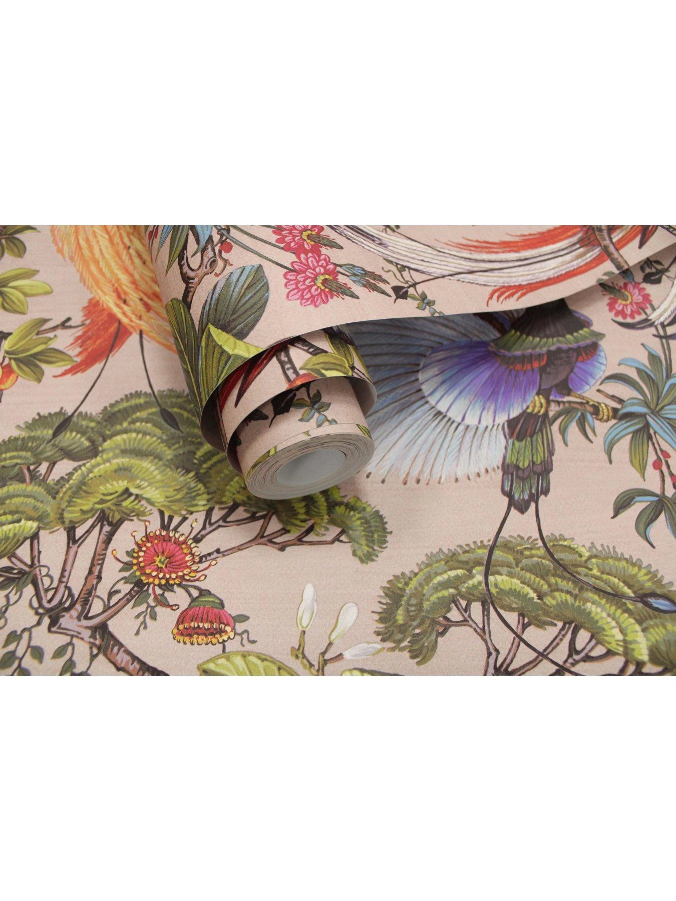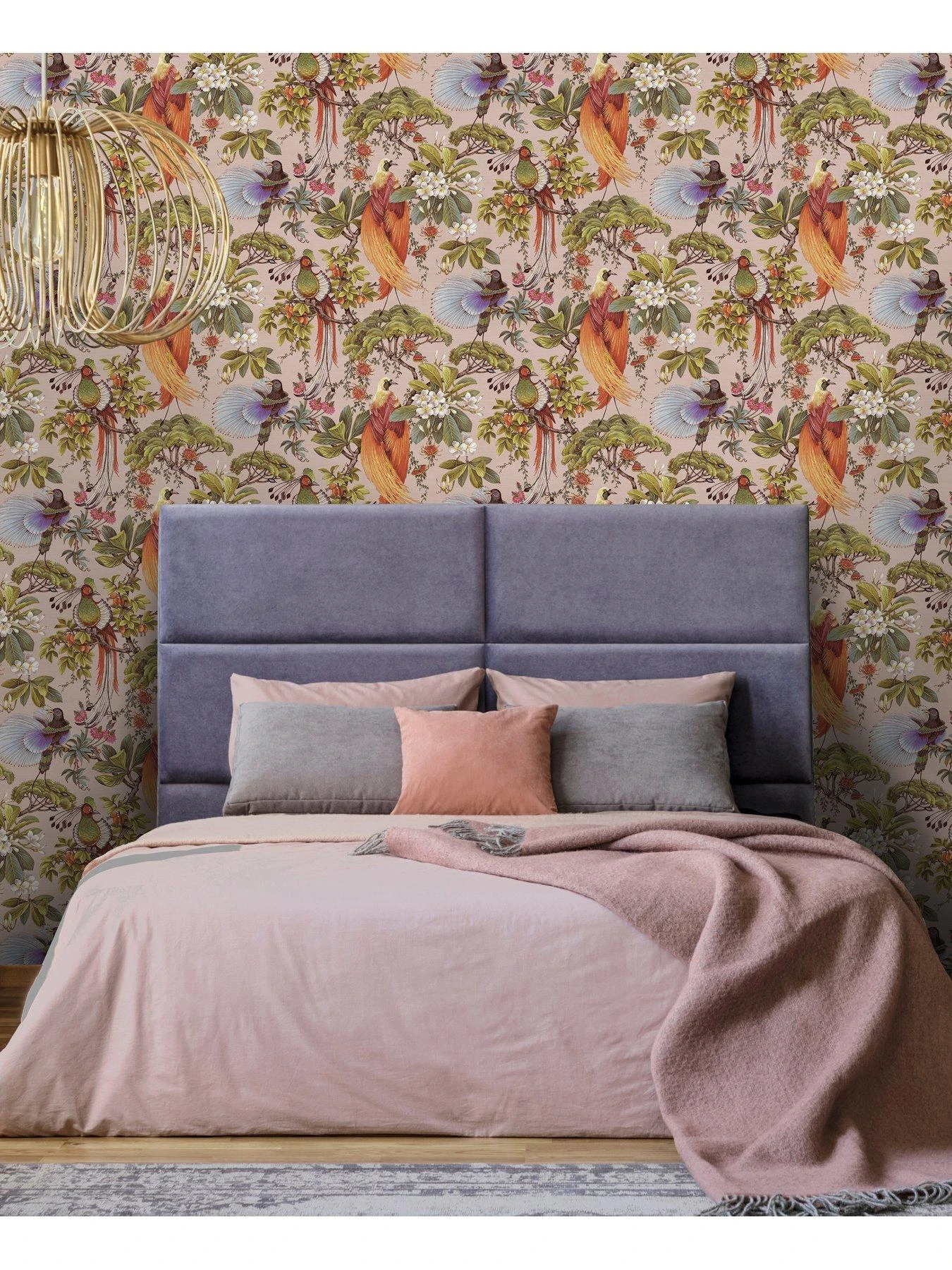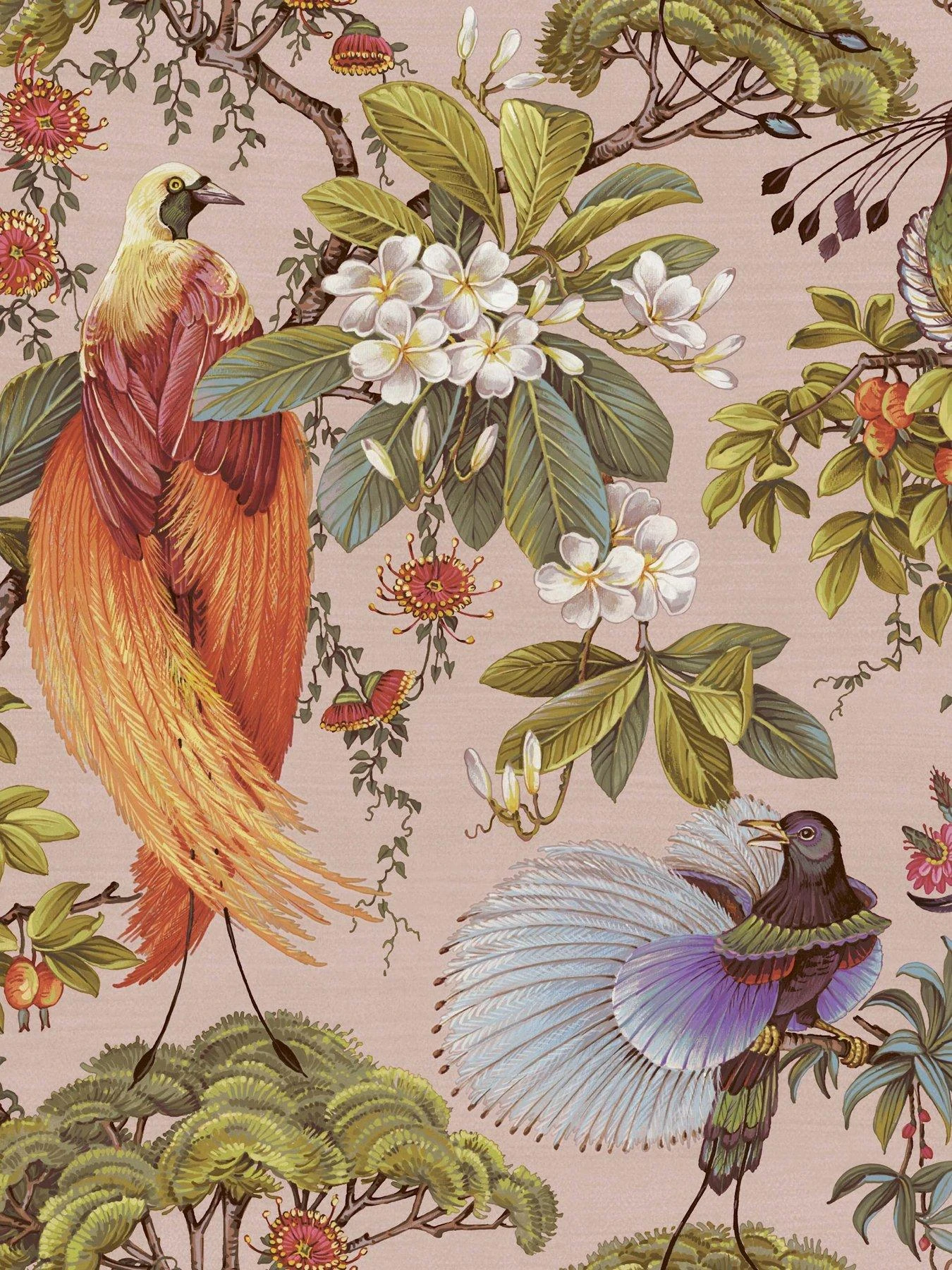 In pink, its gorgeous, painterly design sees a vivid array of tropical birds nestled amongst lush flowers and perfectly preened bonsai trees. As bold shades of orange and teal give way to deep, dramatic pink hues, leaves and reeds in green layer a calming tone, and it’s all set against a dusky pink backdrop so the artwork can take centre stage.
