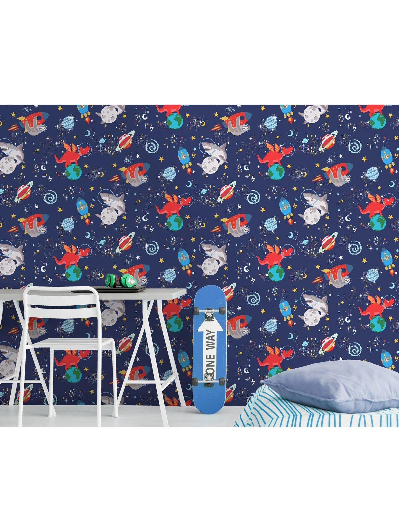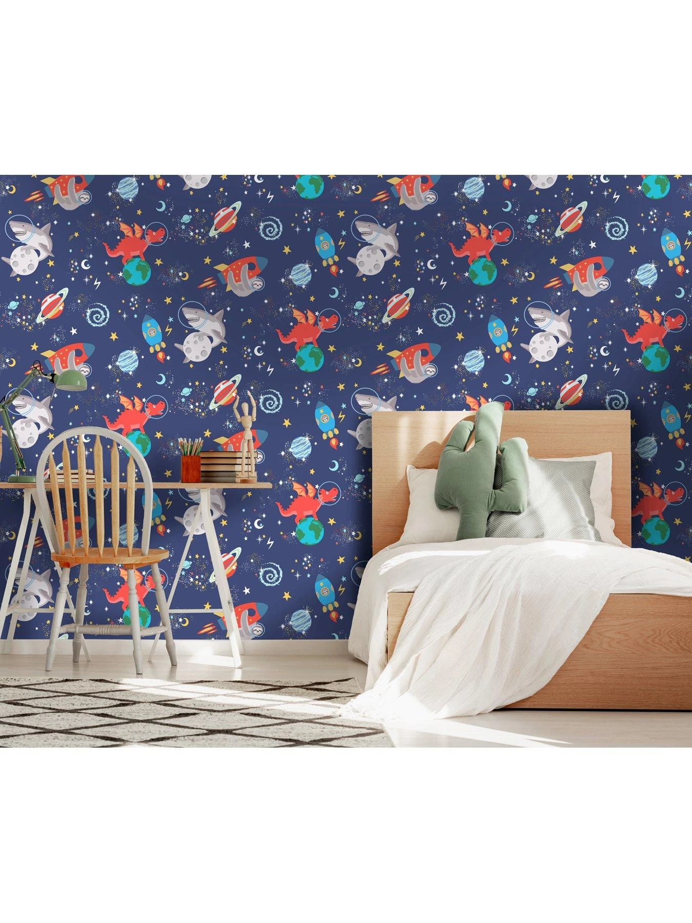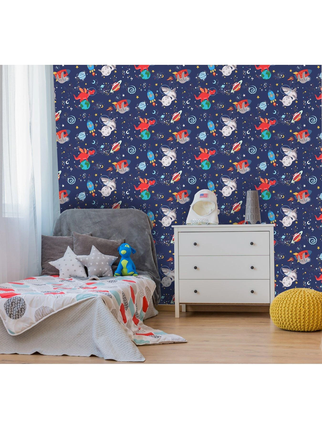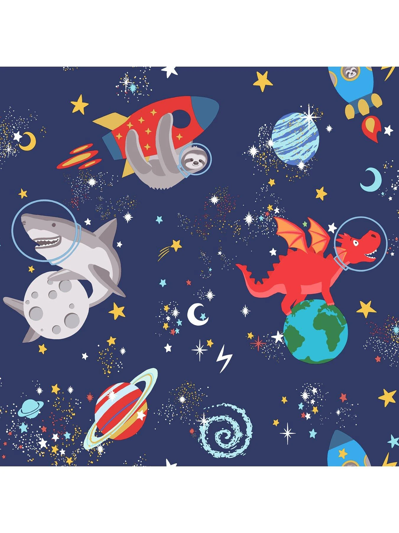 Space animals is a glow in the dark wallpaper that features creatures like sharks, sloths and dragons on a background of stars, moons and planets. Stars and moons will glow when the lights are turned off! Ideal for playrooms and children’s bedrooms.