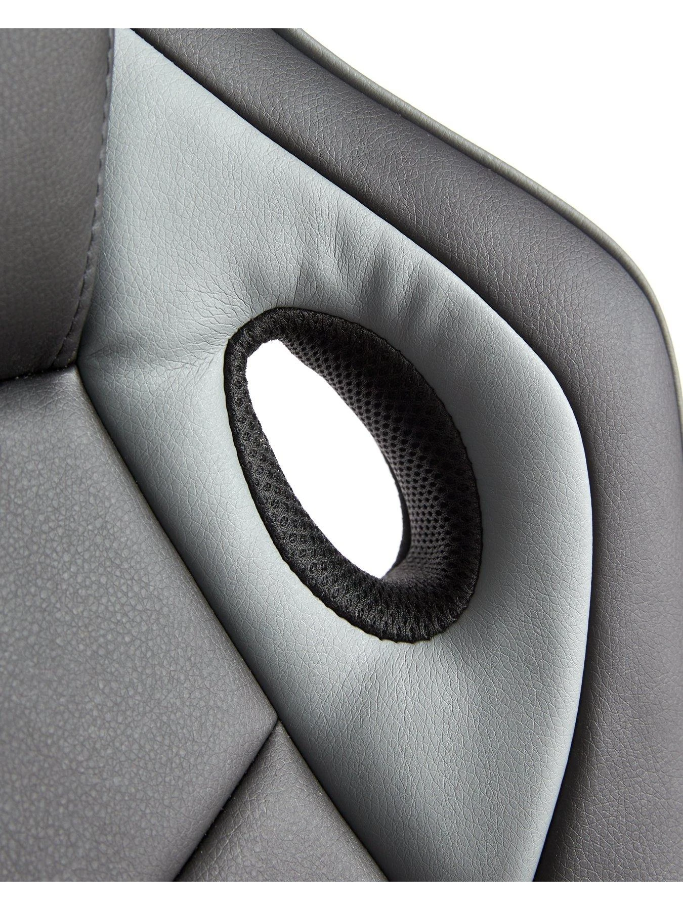 In a cool black and grey two-tone blend, it’s wrapped in a fashionable faux leather fabric and is padded for softness.