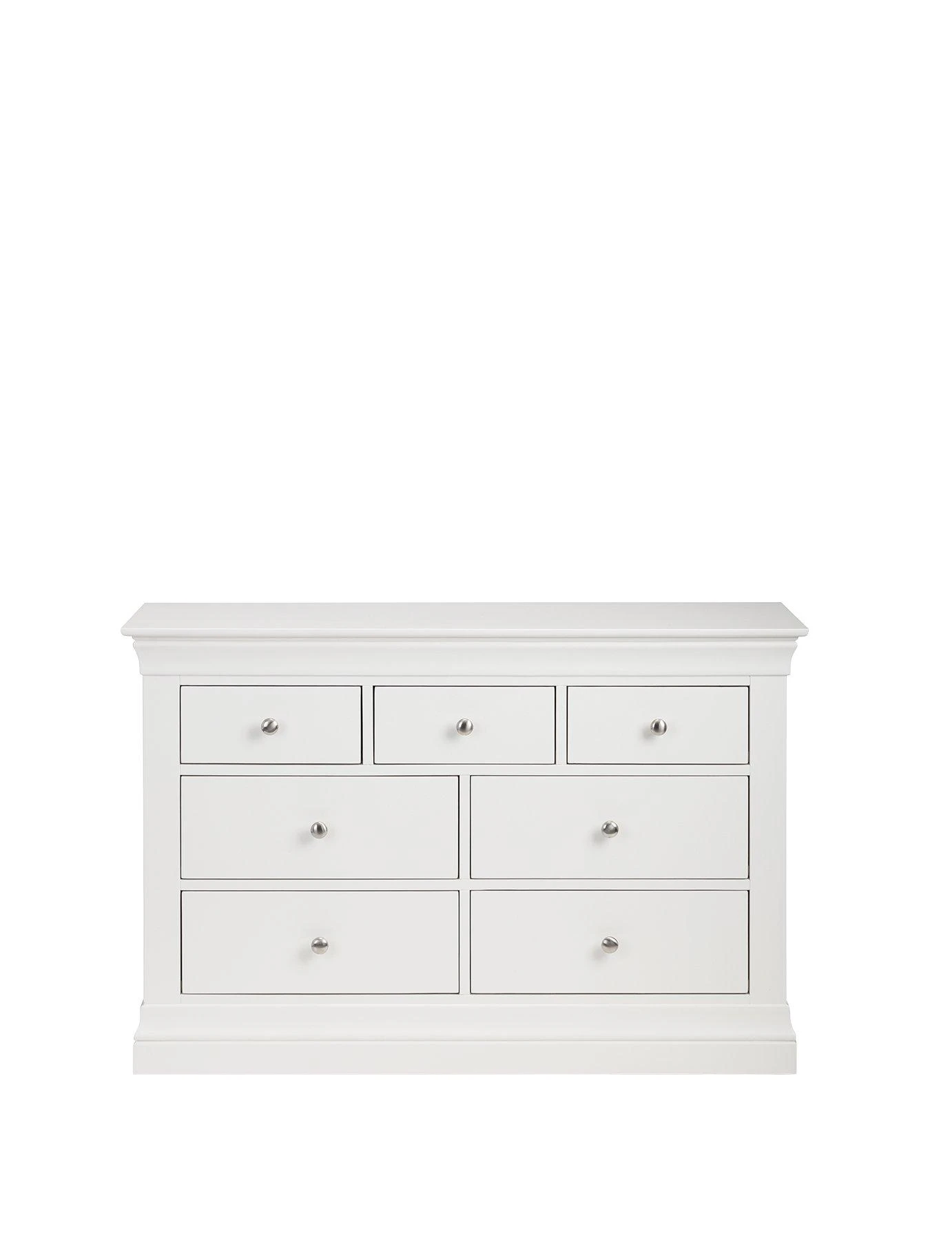 The mix of solid pine and MDF instil the furniture with Sturdiness, and its classic French styling is characterised by a waterfall edged top and chunky plinth. Four large and three small drawers are fitted with dainty metal handles and allow you to neatly separate tees, socks, underwear and more.