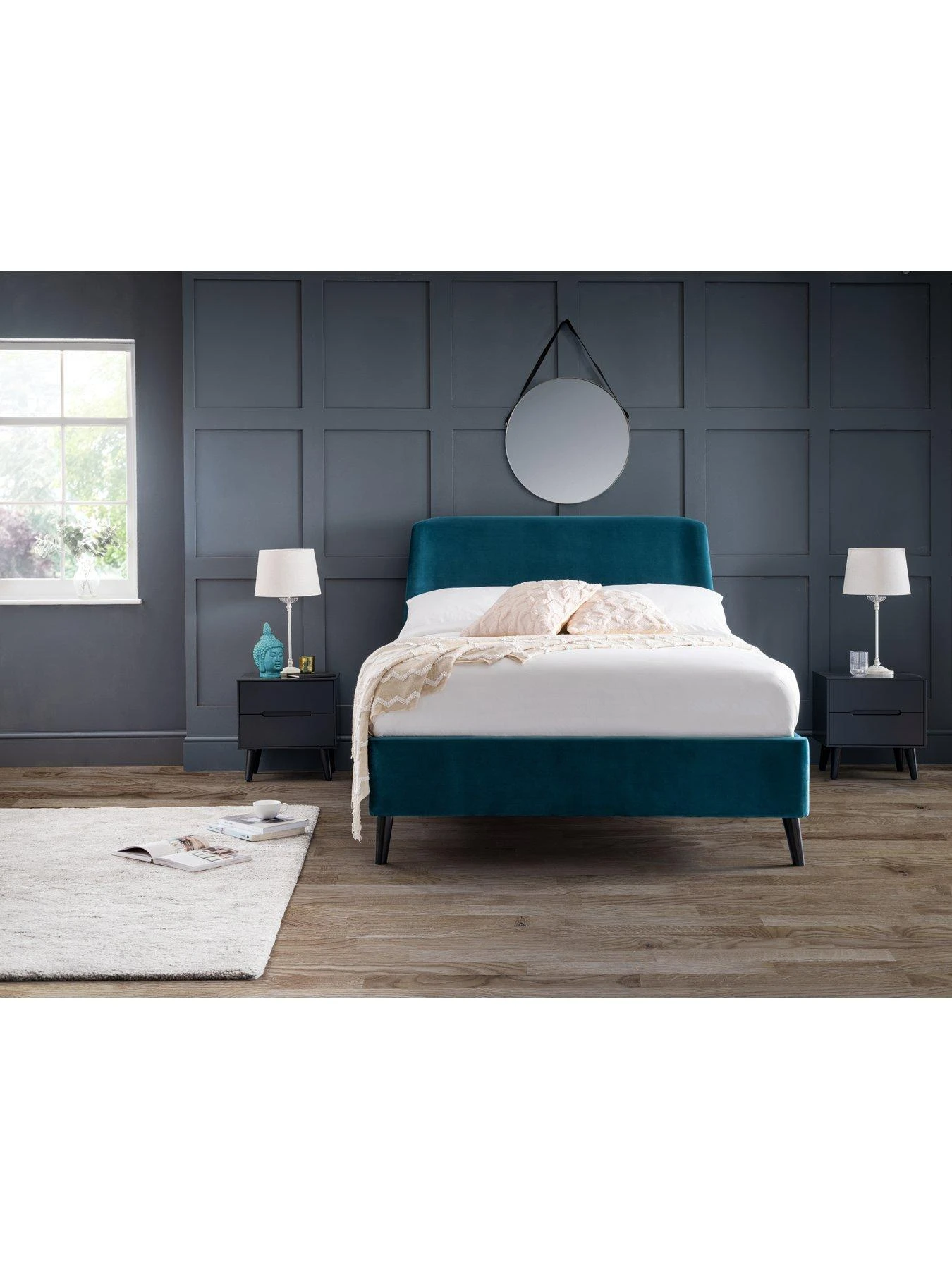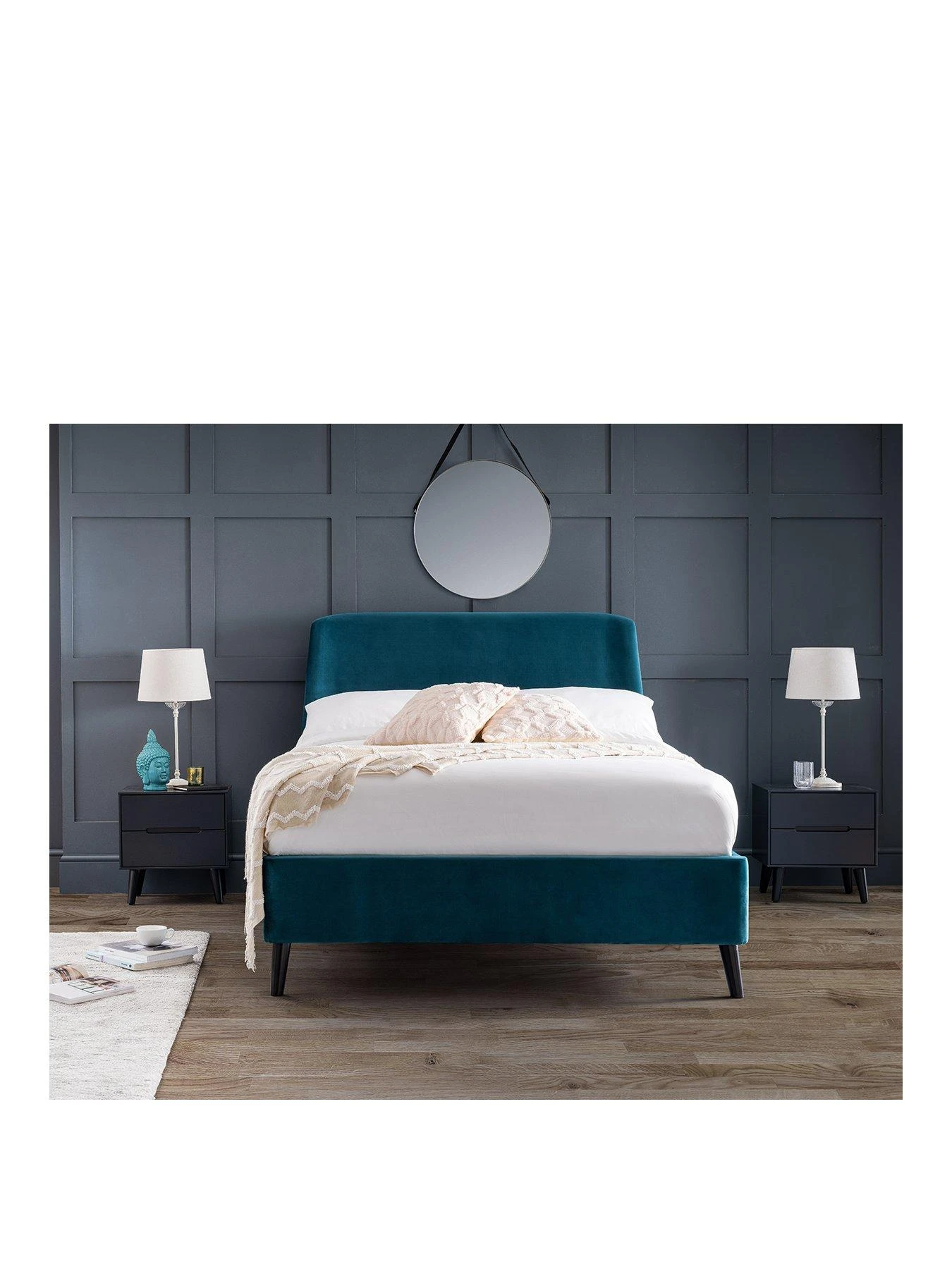 Built around the stunning curved headboard, it’s wrapped in a wonderfully textured velvet that comes in a sunny teal shade. Black Scandi-style legs raise the bed slightly off the floor, and the sprung slats put comfortable support under your mattress (please note: mattress must be purchased separately).