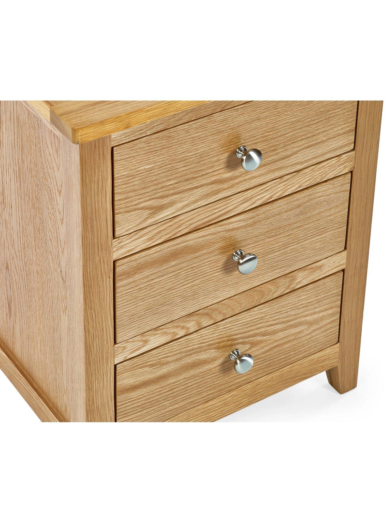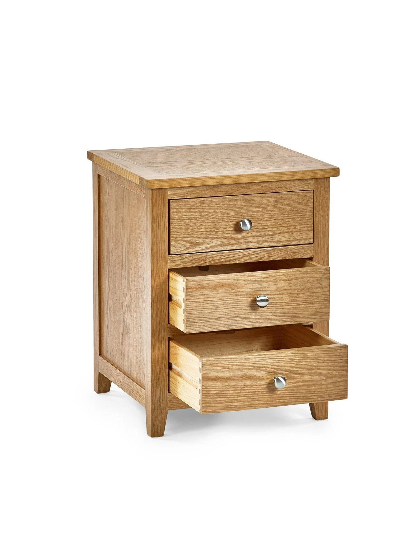 The Mallory 3 Drawer Bedside, crafted from solid oak and oak veneers, features 3 spacious drawers perfect for storing those items needed at hands reach from your bed. The simple, yet stylish design with beautiful silver knobs perfectly complements any bedroom decor.