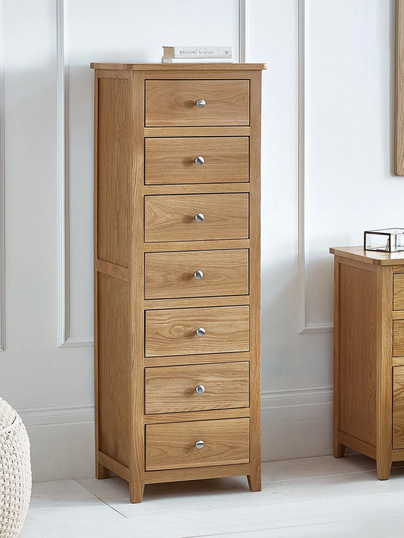 Crafted from solid oak and oak veneers, the Mallory 7 Drawer Narrow Chest provides a simple and stylish storage solution for clothing and other items. Finished with beautiful round silver knobs, the chest perfectly complements any bedroom space.