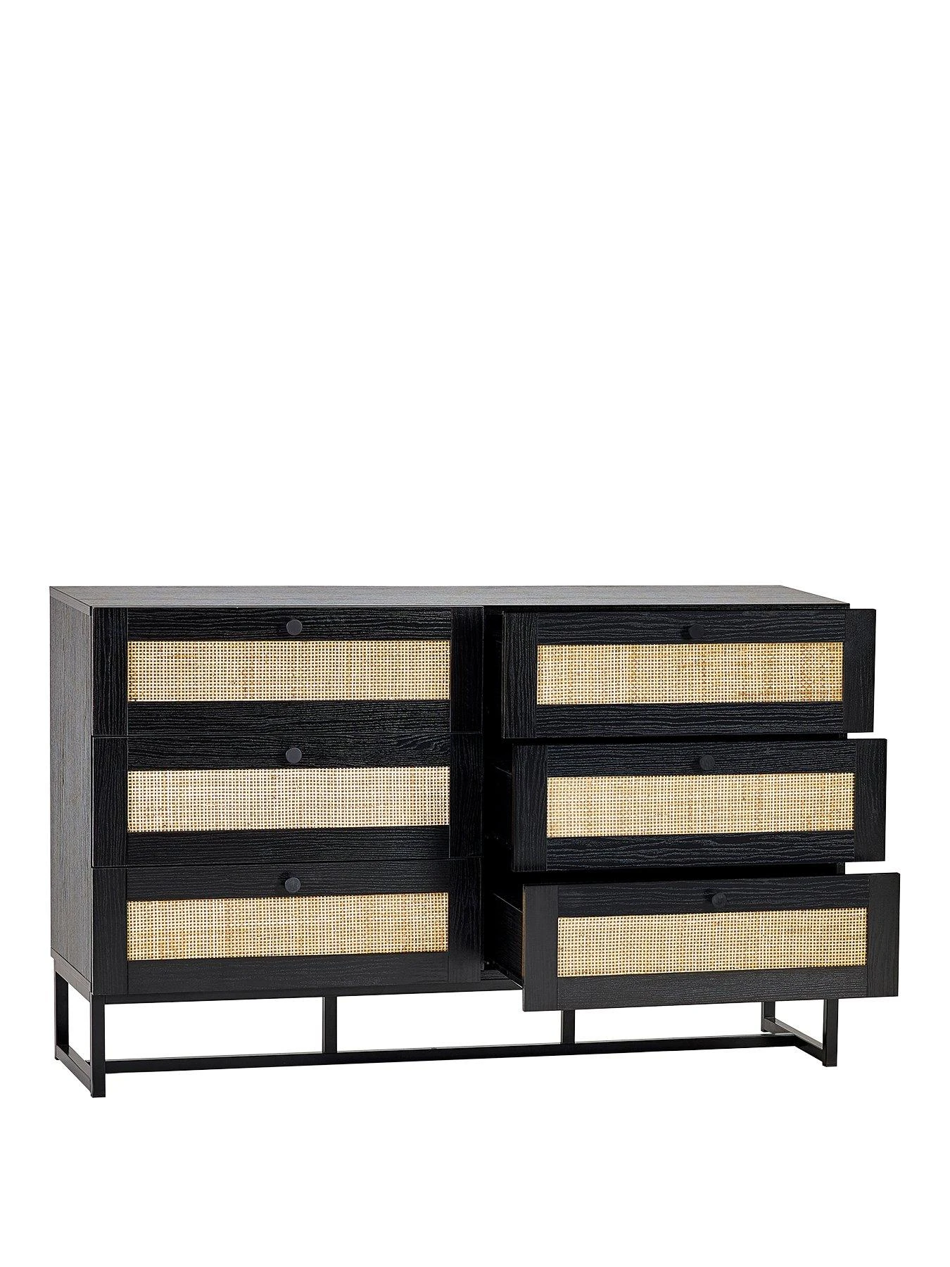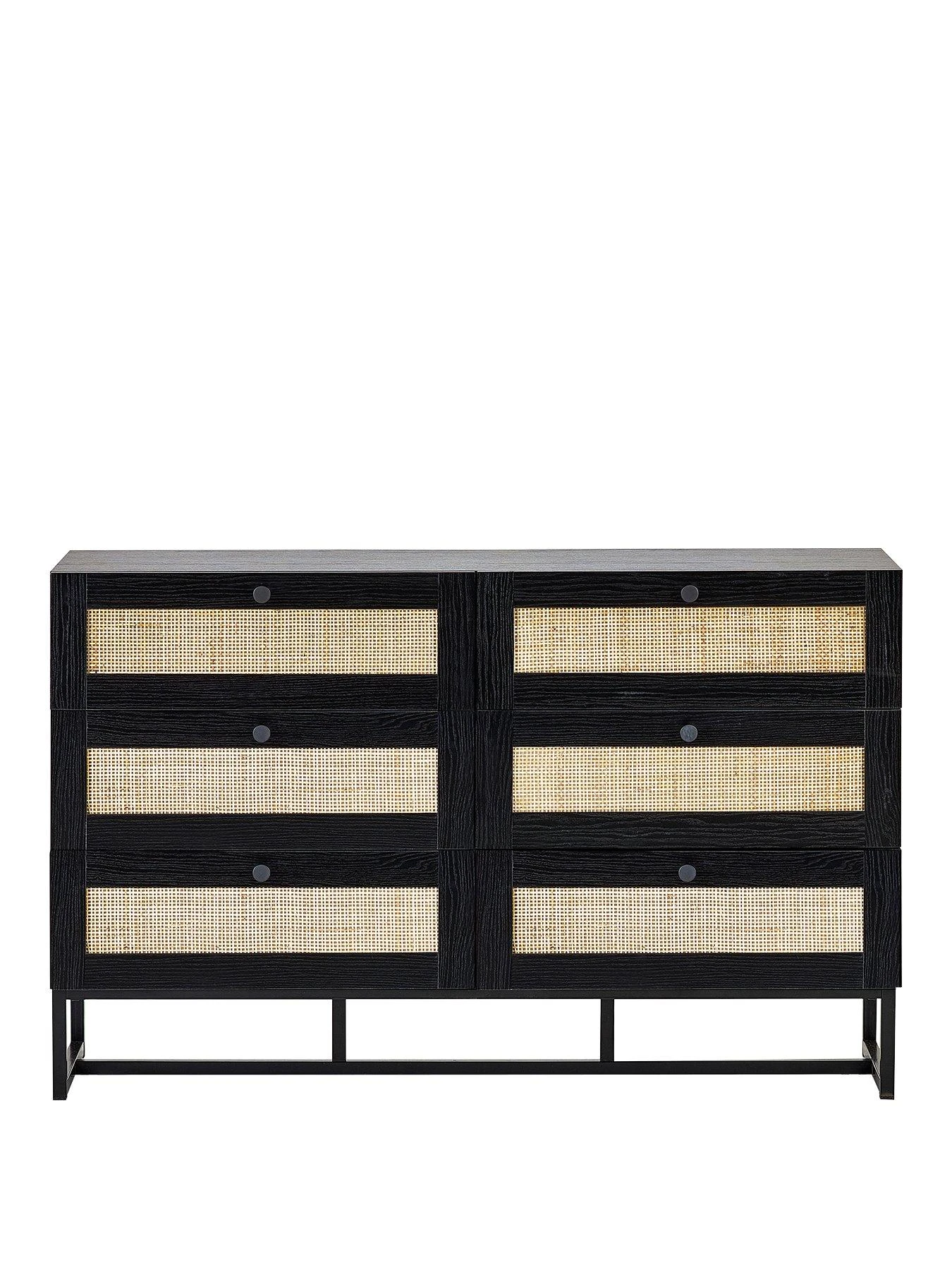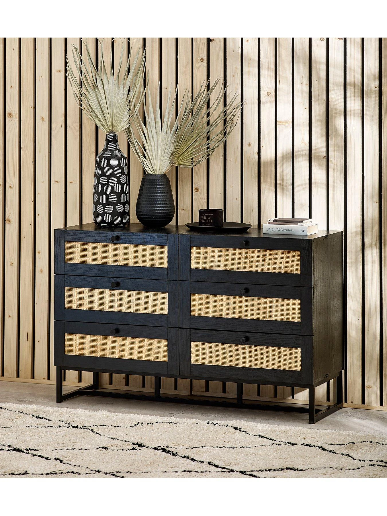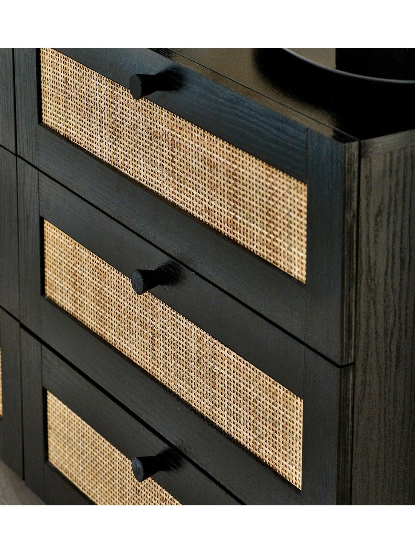 You can pick either oak or grained black to suit the colour scheme of your space, and each one features breathtaking rattan panels to the drawer fronts. The natural rattan gives the furniture a unique and airy appearance that contrasts stunningly against the industrial-inspired metal base.