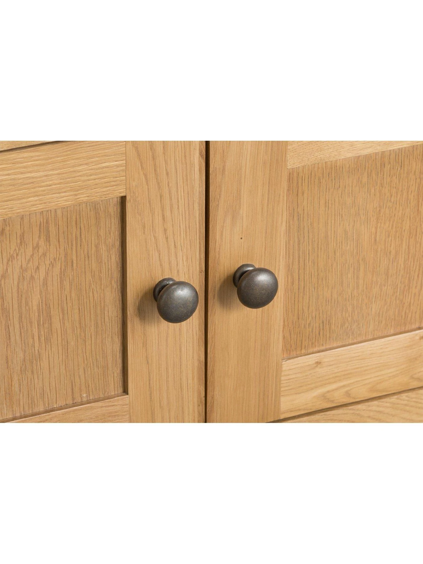 This ready assembled corner TV unit features a pair of traditionally panelled doors that are accented with antique brass effect knobs. An open shelf benefits from a cable management cut-out to keep wires tidy and out of sight.