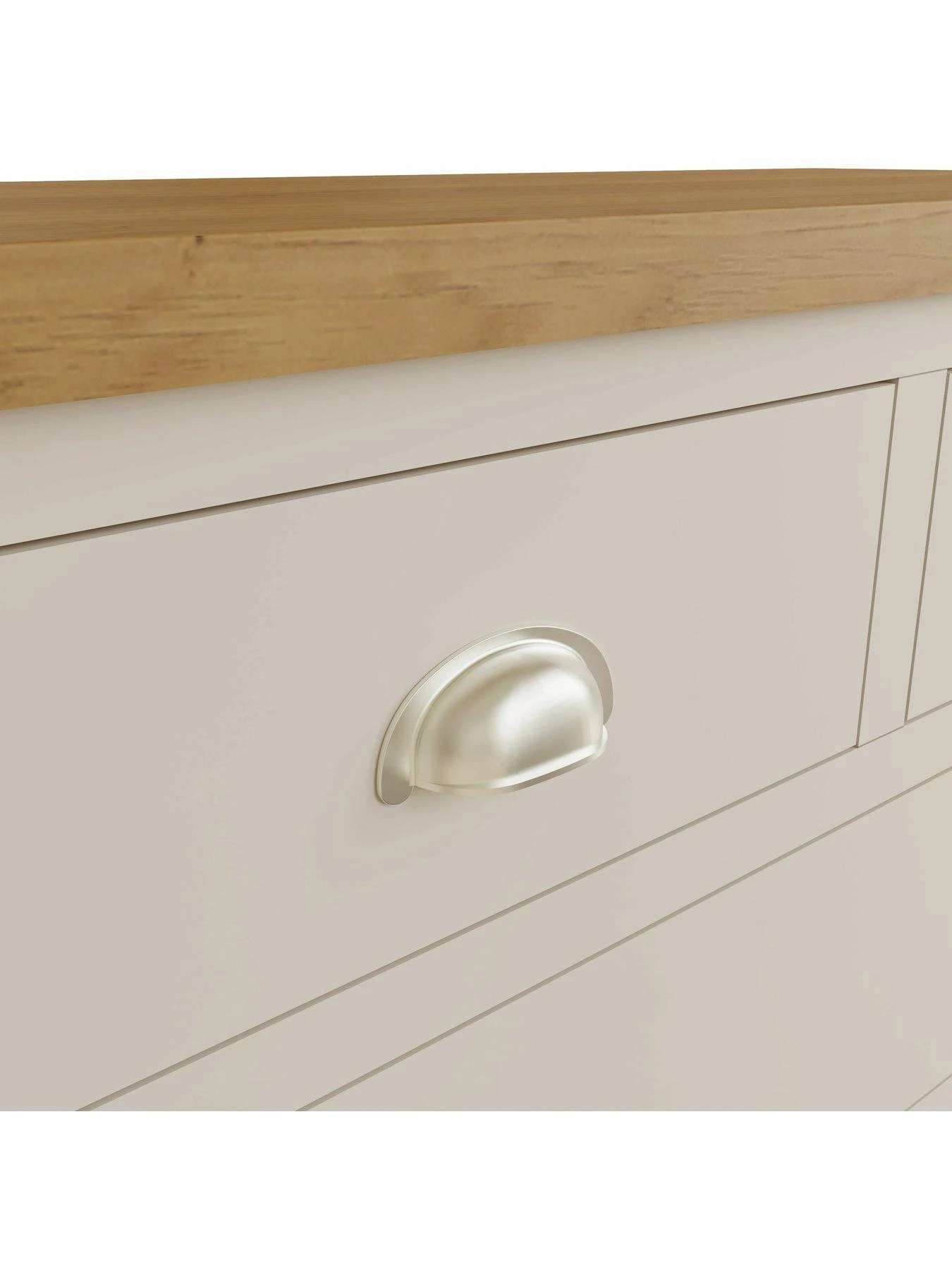 Featuring five drawers to help organise your sleep space, it’s made from solid wood in a smooth dove grey painted shade that will go with any style of bedding and decor. The natural oak top creates an eye-catching contrast, while large brushed chrome effect cup handles add an accent of shine.