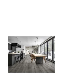 Didnok with deep dark shades of grey and a rustic wood appearance is a true statement floor that perfectly complements any interior. A realistic wood grain and authentic knots and cracks give the floor an expressive impression. The skilfully created wood appearance is enhanced by registered embossing for a natural look and feel.