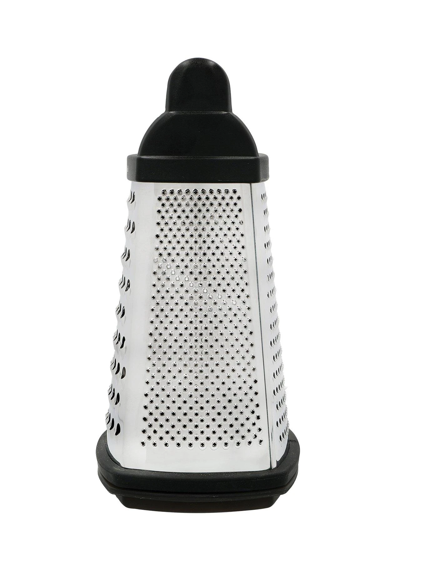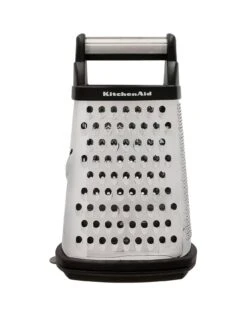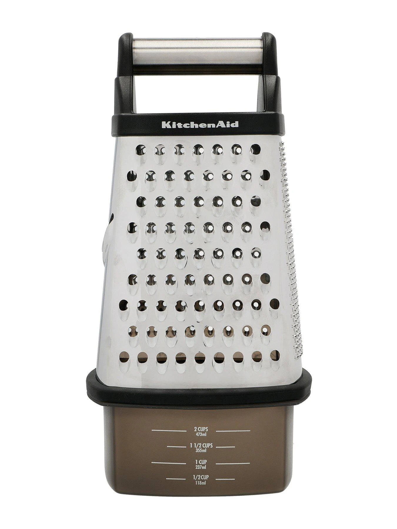 This KitchenAid box grater features four blades – coarse, medium, fine and slice – to quickly grate cheese, chocolate, breadcrumbs and other ingredients. A storage container slots into the base of the grater to catch grated food, helping to reduce mess and allowing for easy storage. The container is marked with ?? cup, 1 cup, 1?? cup and 2 cup capacities, as well as their mililitre equivalents. Dishwasher safe, for quick and easy cleanup.