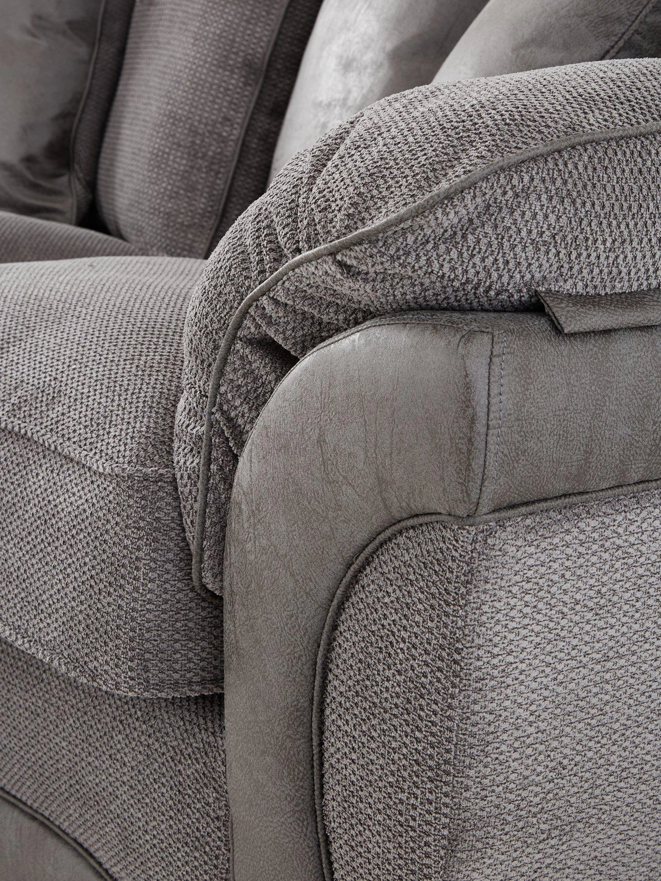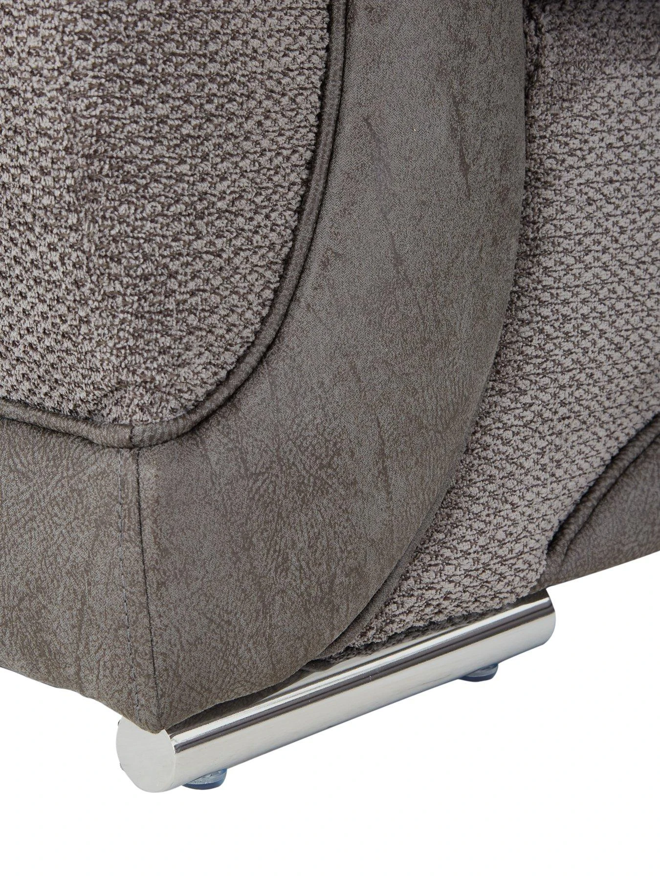 This stylishly spacious corner group features a bold blend of fabrics, as a heavily textured waffle upholstery contrasts against faux suede accents to the arms, fascia and cushions. It’s available in a soft grey hue that will go with any style of existing decor, while shiny chrome bar feet finish the contemporary look.