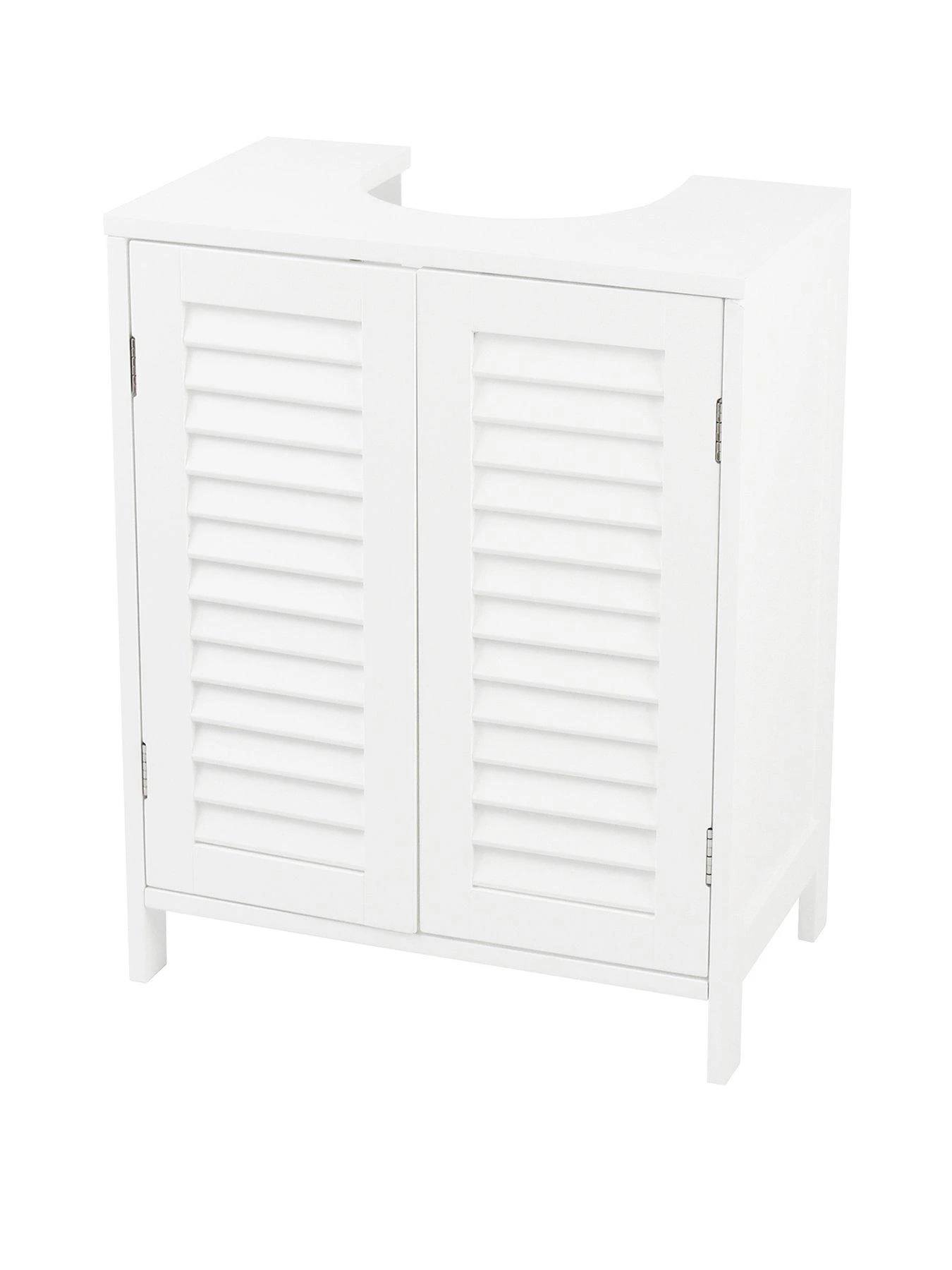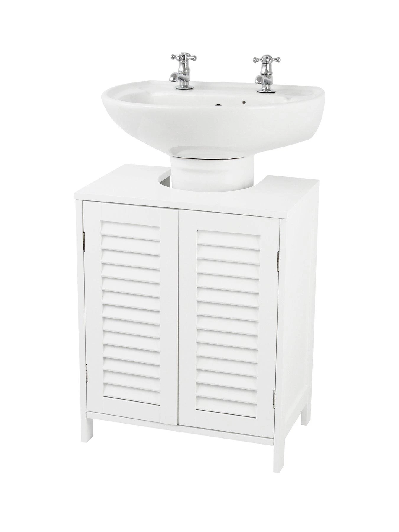 Simple yet eye-catching in a classic white painted finish, the unique look sees two internal shelves hidden behind shutter-style double louvre doors, meaning you can keep shower gel, bubble bath and other toiletries and essentials out of sight.