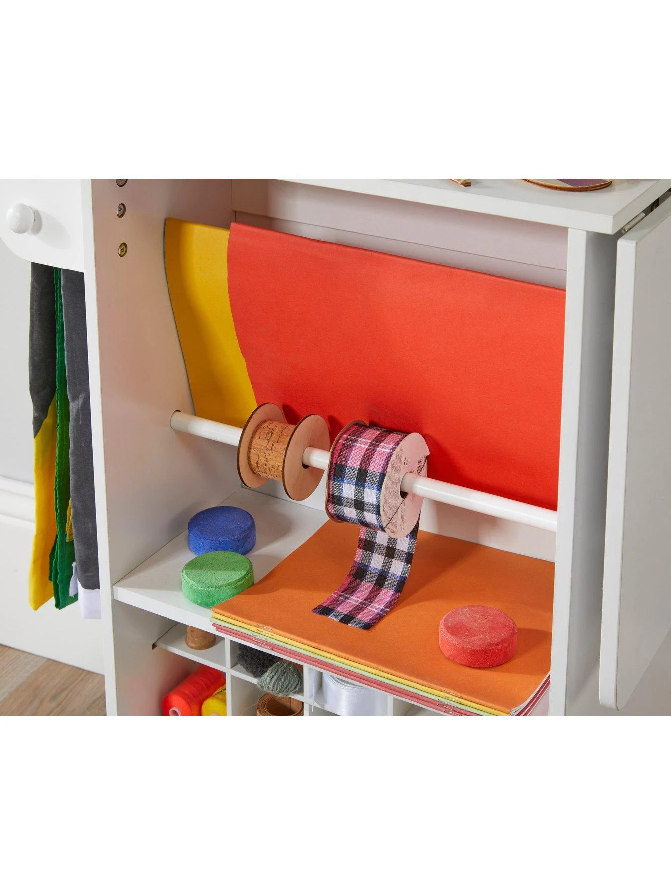 This medium craft desk is the perfect storage for all those arts and crafts to be kept once done with to keep everything tidy. The desk includes 3 pull-out drawers, an extenable side platform and multiple storage sections throughout.