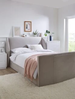 Upholstered in a soft and textural grey coloured fabric, its large winged headboard is softly padded for extra comfort when you’re sitting up in bed. The sprung slatted base can be manually lifted with the help of the hydraulic pistons to reveal a large storage area where you can keep spare bedding organised and out of sight.