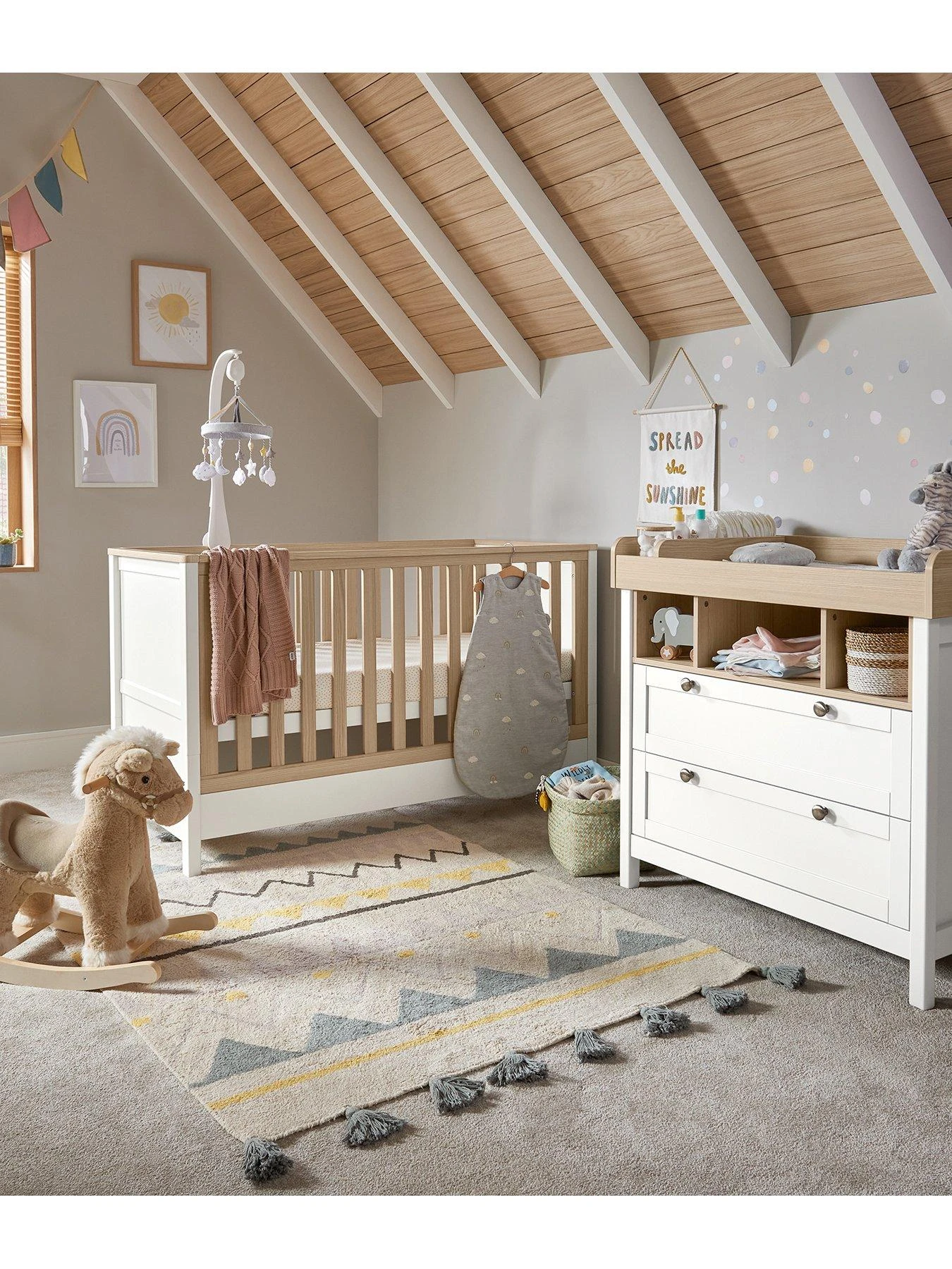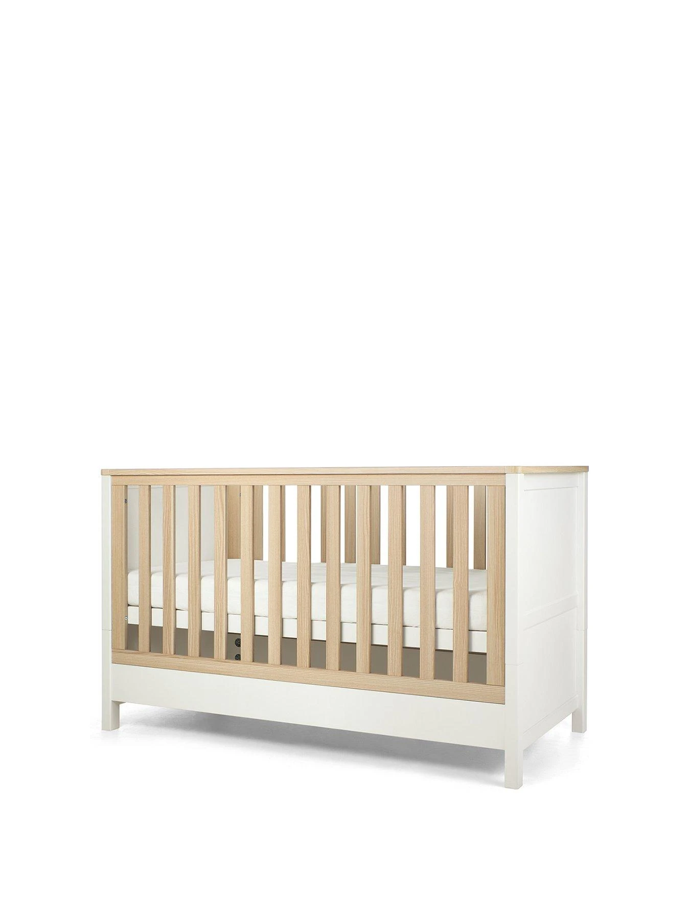 Add a touch of playfulness to your little one’s nursery with Mamas and Papas’ Harwell furniture range. With a neutral colour palette and painted pine finish, it’ll look the part placed in any contemporary or classic nursery. And because these pieces feature plenty of adjustable storage, the Harwell range can grow and change as your baby does.This 2-piece Harwell set has your nursery essentials covered, includes cotbed and dresser changer: Your little one will enjoy peaceful snoozes in this cotbed. It’s got 3 adjustable base heights and easily converts into a toddler bed without you having to store any extra pieces – so you won’t need to upgrade your furniture when your little one has a growth spurt. And with its clean finish with accented pine details, it’ll look great in any kind of nursery. This dresser changer makes changing and dressing your little one easy. It’s got a removable top – so you won’t need to upgrade your furniture when your little one has a growth spurt. And thanks to the drawers and open box-style storage space, there’ll be plenty of room for all of your toddler’s toys and clean outfits.