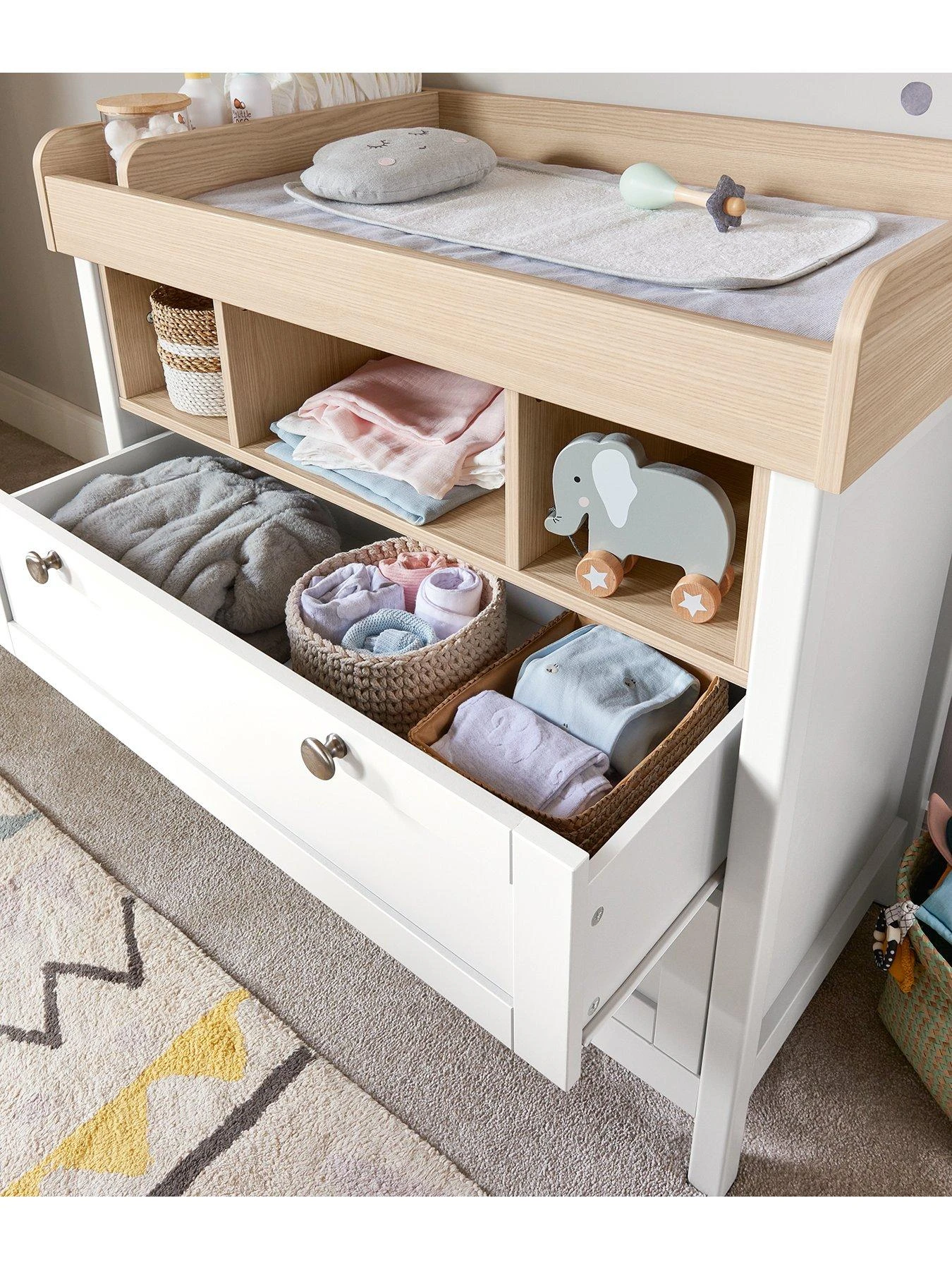 - Plenty of space for nappies with 2 drawers and 3 open storage shelves